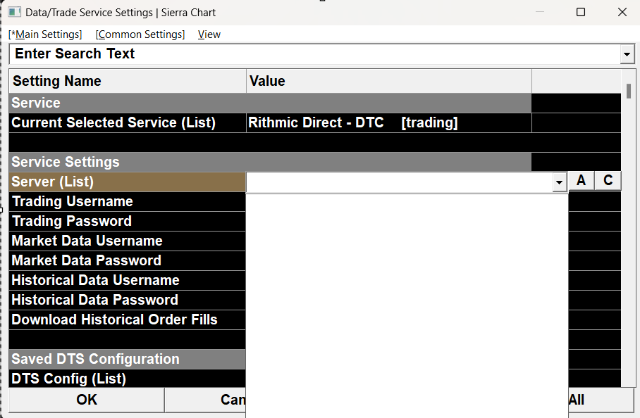 Hello, I am trying to connect to Apex Trader Prop Firm. However, on the Server (List), nothing appears - it is blank (see screenshot). Shouldnt I see a list of Servers to choose from when I select Rithmic? Thanks, Neil |