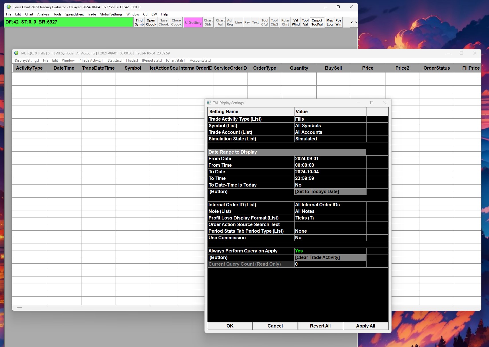 - I have two instances: SC_1 (2) and SierraChart (1). Both are running Version 2679 64-bit on Service “Trading Evaluator - Delayed” - In instance 2, my order fills are displayed in the charts, but not in the trade activity log. However, on the Cash Balance, I see they are updated. - In Instance 1, I only see order fills for Sim1 but not for the other accounts. However, on the Cash Balance, I see they are updated. Trade Service Log of instance 1: 2024-10-03 09:46:51.335 | TradeActivity files query time: 0.065859 seconds. Entries: 1431. Current queries: 2 2024-10-03 09:49:08.534 | TradeActivity files query time: 0.000110 seconds. Entries: 0. Current queries: 1 Trade Service Log of instance 2: 2024-10-03 06:51:52.409 | Trading Evaluator - Delayed | Received 1 order fills for account: CT_FBGL_1. Inserting the ones that do not exist. 2024-10-03 06:51:52.409 | Trading Evaluator - Delayed | Received 0 historical account balance updates for account: CT_FBGL_1. 2024-10-03 06:51:52.412 | RemoveDuplicateFillActivity | TradeAccount: CT_FBGL_1. DatesOfRecordsToInsert: 2024-10-02, . MostRecentFileNameSearched: TradeActivityLog_2024-10-02_UTC.CT_FBGL_1.data. DuplicateRecordsRemovedCount: 1. OriginalRecordsToInsertCount: 1. RecordsToInsertCount: 0 2024-10-03 06:51:52.412 | TradeActivity files query time: 0.003021 seconds. Entries: 0. Current queries: 1 2024-10-03 06:52:40.961 | TradeActivity files query time: 0.050362 seconds. Entries: 0. Current queries: 2 2024-10-03 06:52:40.961 | TradeActivity files query time: 0.000223 seconds. Entries: 0. Current queries: 1 2024-10-03 06:52:59.313 | TradeActivity files query time: 0.000082 seconds. Entries: 0. Current queries: 1 2024-10-03 06:53:01.358 | TradeActivity files query time: 0.000184 seconds. Entries: 0. Current queries: 1 The attached file shows instance 2 with my display settings, Trading Window and Order Fills .. |