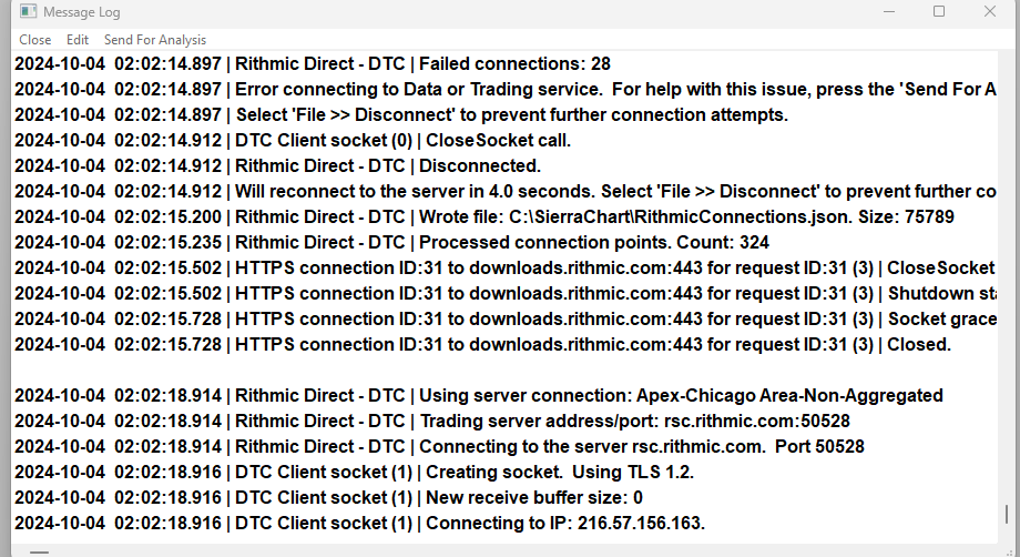 This looks like it is caused by security software or a firewall on your computer: 2024-12-05 08:12:01.781 | DTC Client socket (2) | Connect event error. Windows error code 10060: A connection attempt failed because the connected party did not properly respond after a period of time, or established connection failed because connected host has failed to respond. * Try disabling those. Or the connection is getting blocked somewhere else. But clearly the connection is getting blocked. Refer to: Data/Trading Service Connection and Symbol Issues: 1.2. Network Communication or Server Problem Sierra Chart Support - Engineering Level Your definitive source for support. Other responses are from users. Try to keep your questions brief and to the point. Be aware of support policy: https://www.sierrachart.com/index.php?l=PostingInformation.php#GeneralInformation For the most reliable, advanced, and zero cost futures order routing, use the Teton service: Sierra Chart Teton Futures Order Routing Date Time Of Last Edit: 2024-12-05 14:24:27