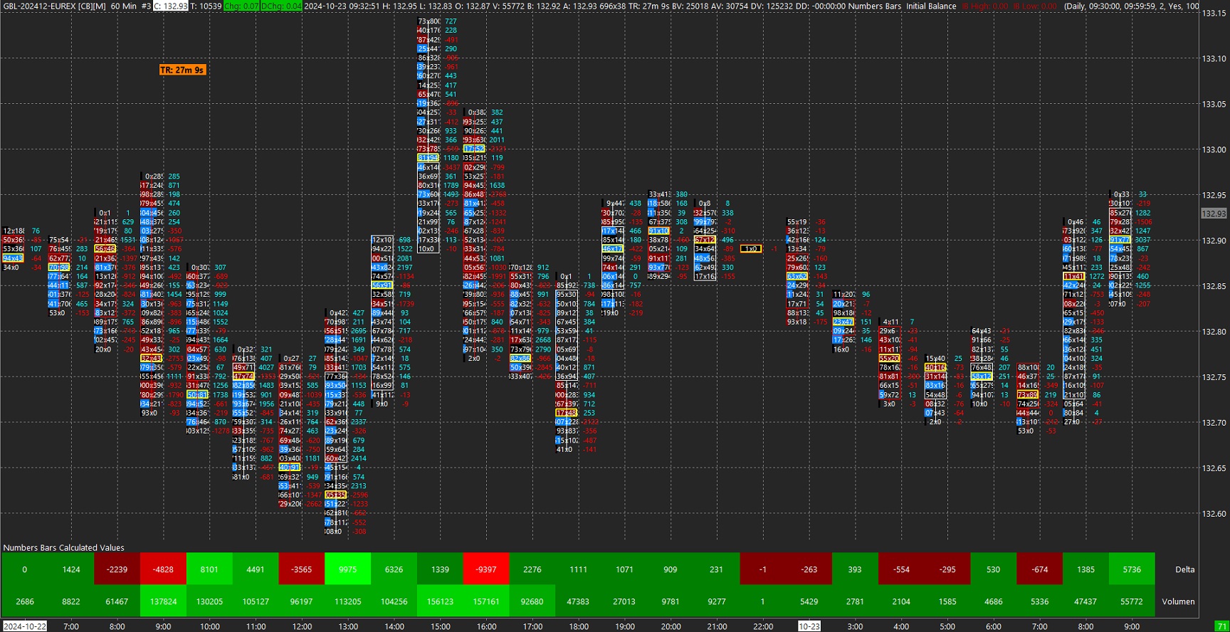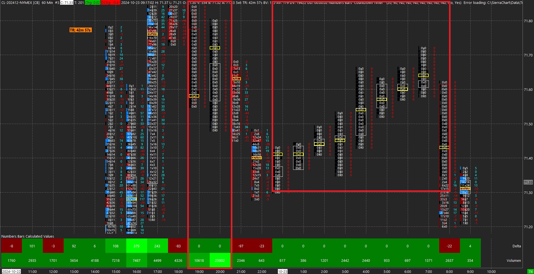 The problem persists. When the computer is on and Sierra Chart is running, data is fully available in the footprint. When the computer is off, after a period of time is online again, the data is missing in the footprint for this period. The chart shows the time phases when the computer was off and no data was loaded in the FP. In the abbreviation GBL (EUREX) {Appendix “FP_GBL”} the price data is available in the footprint for the same period as for CL. Date Time Of Last Edit: 2024-10-23 07:36:32