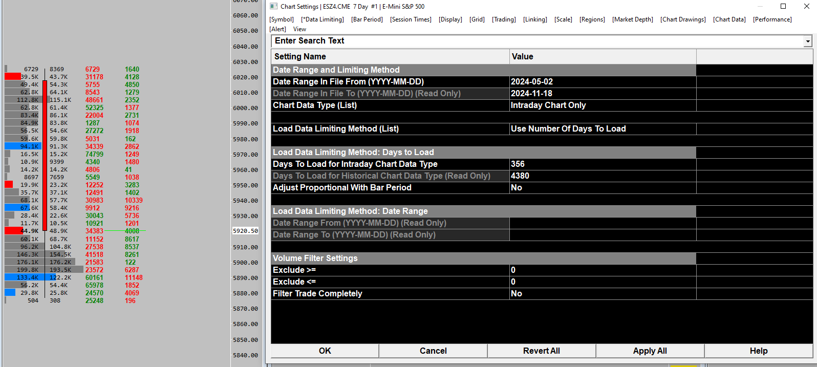 You are changing the wrong date entry item. You need to set the option for "Load Data Limiting Method" to "Date Range". Then you can enter the start date of the data to load in the chart and leave the end date as blank in order to get the most current data. Refer to the following: Chart Settings: Load Data Limiting Method (Chart >> Chart Settings >> Data Limiting >> Date Range and Limiting Method) Chart Settings: Load Data Limiting Method: Date Range >> Date Range From / To (Chart >> Chart Settings >> Data Limiting >> Load Data Limiting Method: Date Range menu) Make sure that the entered start date is the day of the week you want for your starting date. The reason the date you are changing (Date Range in File From) is not changing, is that this is a Futures Contract with a limited start and end date. 5/2/2024 must be the start of the data for that symbol. In order to get additional data going further back, you would need to use a Continuous Futures Contract chart. Refer to the following: Continuous Futures Contract Charts For the most reliable, advanced, and zero cost futures order routing, use the Teton service: Sierra Chart Teton Futures Order Routing |