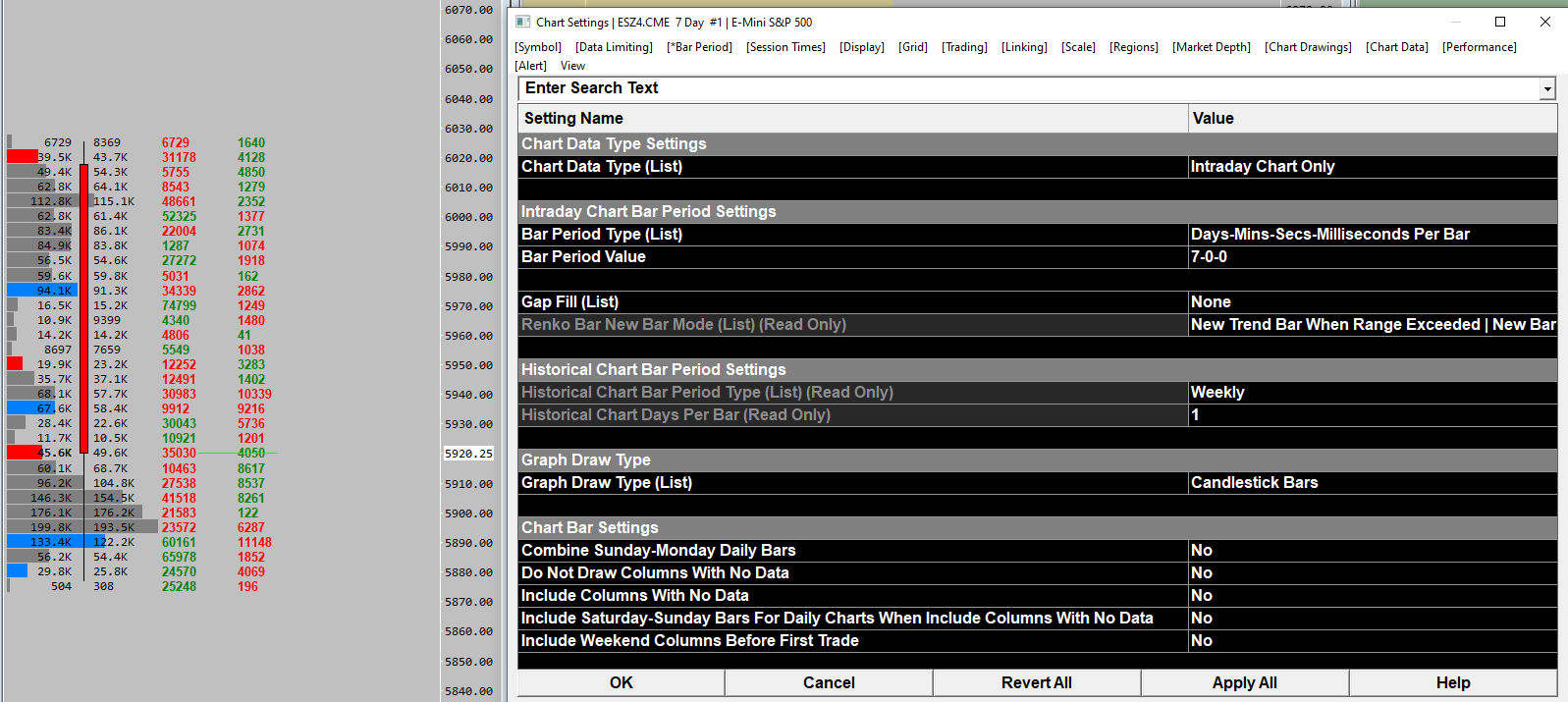 Make sure you have the option for "New Bar At Session Start" set to "Yes". Refer to the following: Chart Settings: New Bar at Session Start (Chart >> Chart Settings >> Session Times >> Intraday Chart Session Times menu) Although we can not tell from your image, as the dates are not visible, and we can only see one bar, you do need for the first date in your chart to be the start of the week, however, you define that. For instance, since you are looking at CME Futures, you may want the first day loaded in the chart to be a Sunday, so you will then capture all the data starting from the open on Sunday evening through the close on Friday evening. Make sure your Session Times are also correct for the time periods you want included. For the most reliable, advanced, and zero cost futures order routing, use the Teton service: Sierra Chart Teton Futures Order Routing |