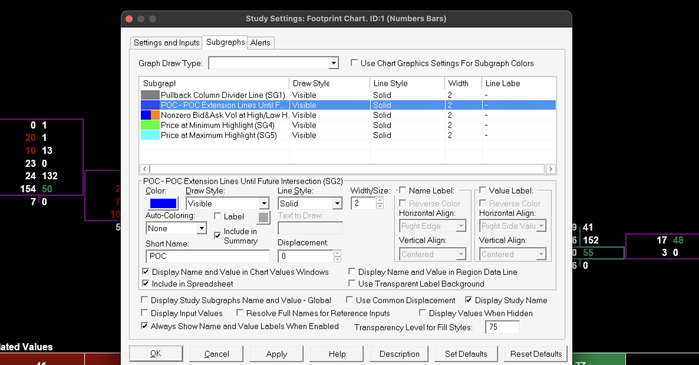 Hello, I'd like to add the Point of Control on my Footprint Chart ($ES)(5mins Chart). I was wondering if you could help me figure that out/input the setting for POC. Thank you very much. Regards Haseeb |