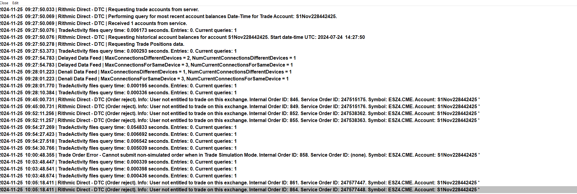 2024-11-25 09:27:50.033 | Rithmic Direct - DTC | Requesting trade accounts from server. 2024-11-25 09:27:50.069 | Rithmic Direct - DTC | Performing query for most recent account balances Date-Time for Trade Account: S1Nov228442425. 2024-11-25 09:27:50.069 | Rithmic Direct - DTC | Received 1 accounts from service. 2024-11-25 09:27:50.076 | TradeActivity files query time: 0.006173 seconds. Entries: 0. Current queries: 1 2024-11-25 09:27:50.076 | Rithmic Direct - DTC | Requesting historical account balances for account S1Nov228442425. Start date-time UTC: 2024-07-24 14:27:50 2024-11-25 09:27:50.278 | Rithmic Direct - DTC | Requesting Trade Positions data. 2024-11-25 09:27:53.373 | TradeActivity files query time: 0.000293 seconds. Entries: 0. Current queries: 1 2024-11-25 09:27:54.783 | Delayed Data Feed | MaxConnectionsDifferentDevices = 2, NumCurrentConnectionsDifferentDevices = 1 2024-11-25 09:27:54.783 | Delayed Data Feed | MaxConnectionsForSameDevice = 3, NumCurrentConnectionsForSameDevice = 1 2024-11-25 09:28:01.223 | Denali Data Feed | MaxConnectionsDifferentDevices = 1, NumCurrentConnectionsDifferentDevices = 1 2024-11-25 09:28:01.223 | Denali Data Feed | MaxConnectionsForSameDevice = 3, NumCurrentConnectionsForSameDevice = 1 2024-11-25 09:28:01.770 | TradeActivity files query time: 0.000195 seconds. Entries: 0. Current queries: 1 2024-11-25 09:28:10.384 | TradeActivity files query time: 0.000336 seconds. Entries: 0. Current queries: 1 2024-11-25 09:45:00.731 | Rithmic Direct - DTC (Order reject). Info: User not entitled to trade on this exchange. Internal Order ID: 846. Service Order ID: 247515175. Symbol: ESZ4.CME. Account: S1Nov228442425 * 2024-11-25 09:45:00.731 | Rithmic Direct - DTC (Order reject). Info: User not entitled to trade on this exchange. Internal Order ID: 849. Service Order ID: 247515176. Symbol: ESZ4.CME. Account: S1Nov228442425 * 2024-11-25 09:52:11.256 | Rithmic Direct - DTC (Order reject). Info: User not entitled to trade on this exchange. Internal Order ID: 852. Service Order ID: 247538362. Symbol: ESZ4.CME. Account: S1Nov228442425 * 2024-11-25 09:52:11.257 | Rithmic Direct - DTC (Order reject). Info: User not entitled to trade on this exchange. Internal Order ID: 855. Service Order ID: 247538363. Symbol: ESZ4.CME. Account: S1Nov228442425 * 2024-11-25 09:54:27.269 | TradeActivity files query time: 0.054833 seconds. Entries: 0. Current queries: 1 2024-11-25 09:54:27.423 | TradeActivity files query time: 0.006692 seconds. Entries: 0. Current queries: 1 2024-11-25 09:54:27.518 | TradeActivity files query time: 0.006542 seconds. Entries: 0. Current queries: 1 2024-11-25 09:54:30.766 | TradeActivity files query time: 0.005039 seconds. Entries: 0. Current queries: 1 2024-11-25 10:00:48.355 | Trade Order Error - Cannot submit non-simulated order when in Trade Simulation Mode. Internal Order ID: 858. Service Order ID: (none). Symbol: ESZ4.CME. Account: S1Nov228442425 * 2024-11-25 10:03:48.447 | TradeActivity files query time: 0.000339 seconds. Entries: 0. Current queries: 1 2024-11-25 10:03:48.541 | TradeActivity files query time: 0.000398 seconds. Entries: 0. Current queries: 1 2024-11-25 10:03:48.674 | TradeActivity files query time: 0.000436 seconds. Entries: 0. Current queries: 1 2024-11-25 10:05:18.411 | Rithmic Direct - DTC (Order reject). Info: User not entitled to trade on this exchange. Internal Order ID: 861. Service Order ID: 247577447. Symbol: ESZ4.CME. Account: S1Nov228442425 * 2024-11-25 10:05:18.411 | Rithmic Direct - DTC (Order reject). Info: User not entitled to trade on this exchange. Internal Order ID: 864. Service Order ID: 247577448. Symbol: ESZ4.CME. Account: S1Nov228442425 * |