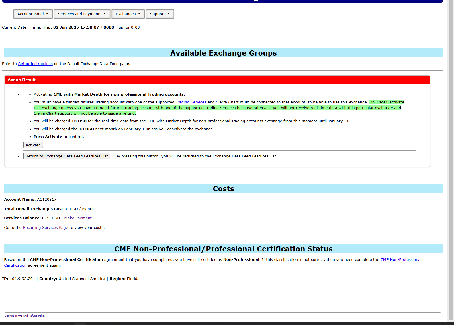 You added $13.00 on January 2, 2025 which gave you enough funds to pay for Package 11 for 1 month ($46.00). But the exchange was already deactivated, and you do not have enough funds to re-activate it. You need to add $26.00 to your account in order to activate the same exchange you had previously. The reason this is $26.00 is that the base cost of the exchange is $13.00, but you have "2 Systems" selected, which doubles your exchange fees to $26.00. You may be seeing $13.00, which is the base fee and not the total you actually need. This would be something we would need to look into as to why you are not being given the total. You can view the transactions for your account at the following link: https://www.sierrachart.com/UserControlPanel.php?page=TransactionLog For the most reliable, advanced, and zero cost futures order routing, use the Teton service: Sierra Chart Teton Futures Order Routing |
