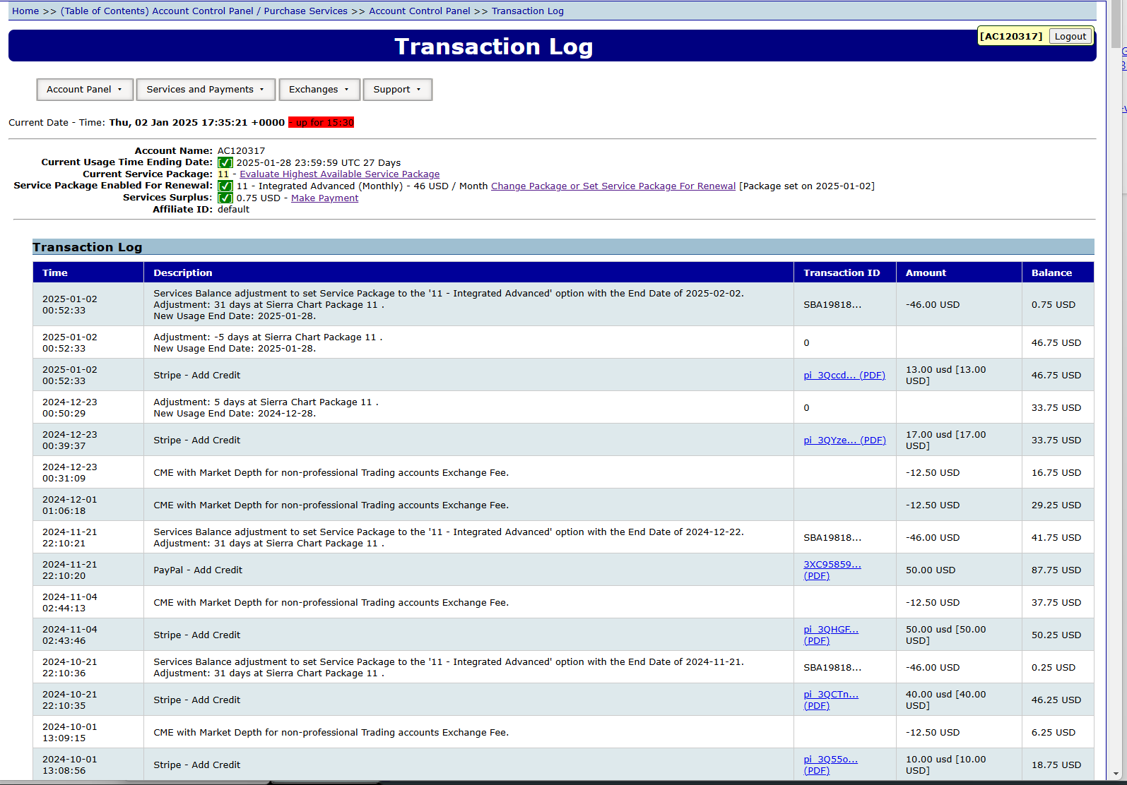 You can see your transactions here: https://www.sierrachart.com/UserControlPanel.php?page=TransactionLog You can see your recurring services and the cost here: https://www.sierrachart.com/UserControlPanel.php?page=RecurringServices If you use our new PayPal V2 payment option here you can save a card and enable automatic payments: https://www.sierrachart.com/UserControlPanel.php?page=AddAccountCredit (Scroll down to the section "Pay with PayPal V2 with Auto Billing Support") Sierra Chart Support - Engineering Level Your definitive source for support. Other responses are from users. Try to keep your questions brief and to the point. Be aware of support policy: https://www.sierrachart.com/index.php?l=PostingInformation.php#GeneralInformation For the most reliable, advanced, and zero cost futures order routing, use the Teton service: Sierra Chart Teton Futures Order Routing |