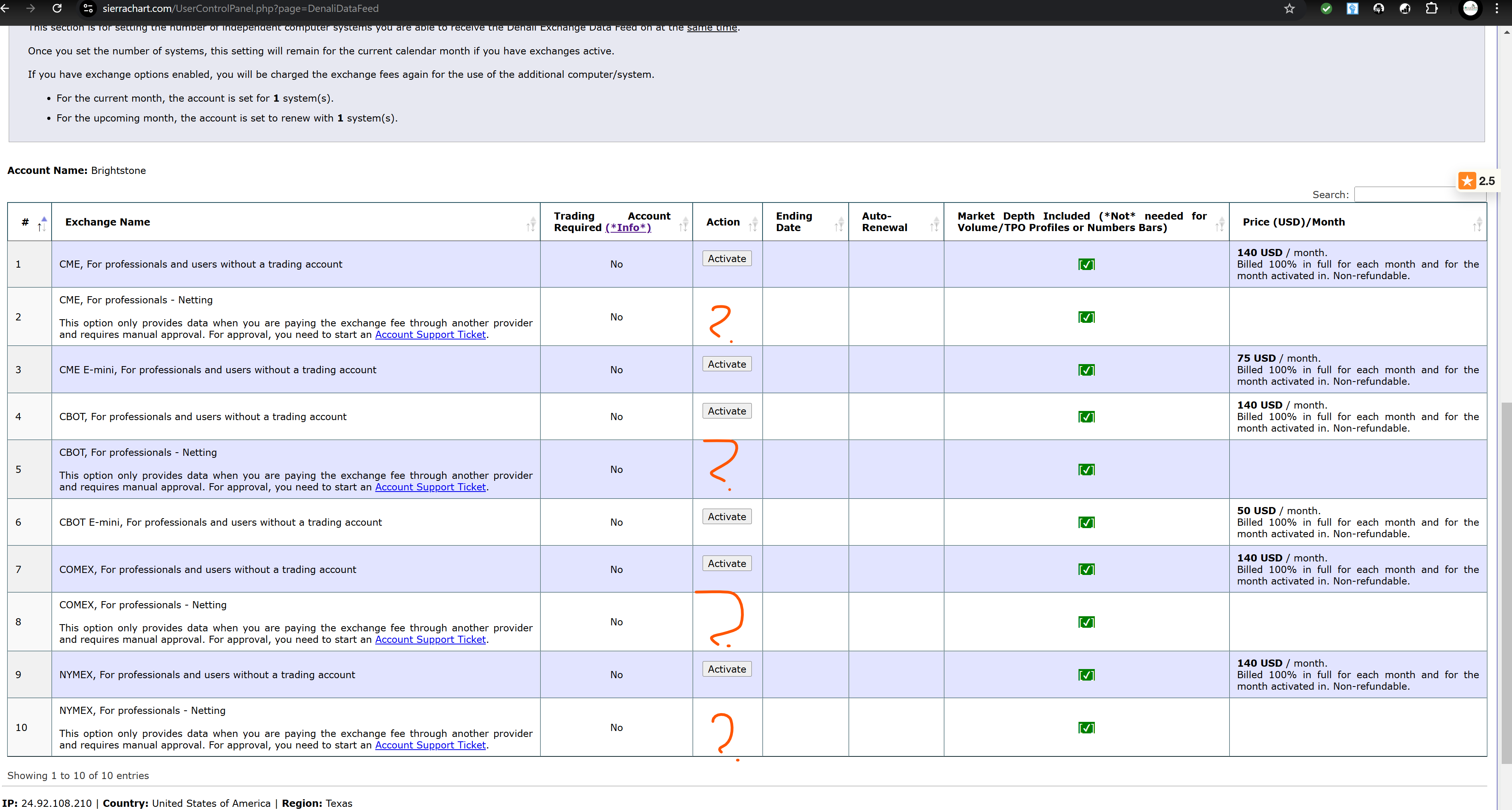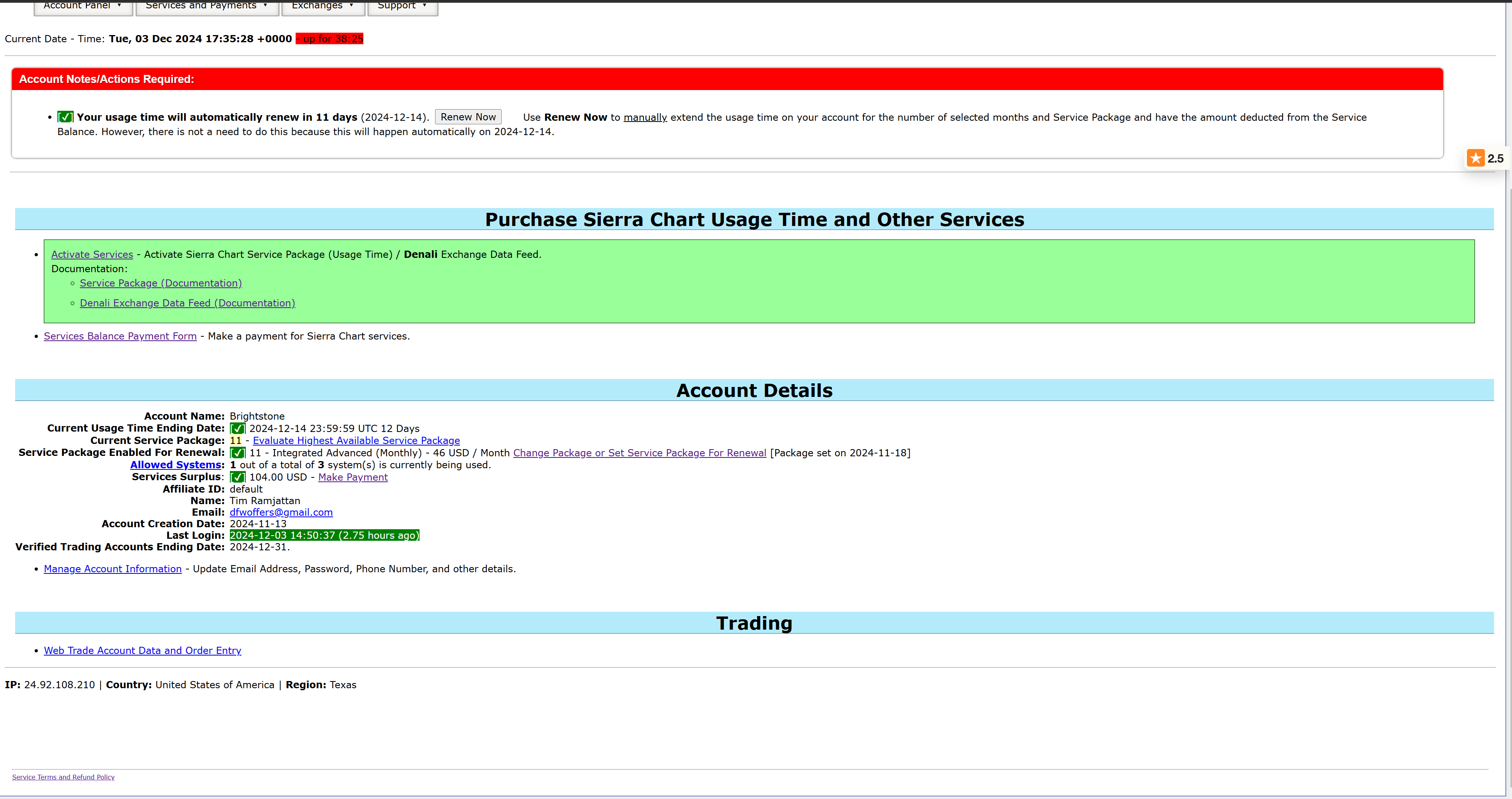 I can promise you i've compared my Sierra chart real time data to my Tradingview RTD & NinjaTrader execution platform RTD and confirmed the ticks and real time data was all in sync with each other. i made about 4 winning trades on my Ninjatrader execution platform over the last 2 weeks based on my Sierra Chart real time data.. Im not sure where this real time data is coming from but i know i paid $104 total to Sierra charts since i set up Sierra charts 2 weeks ago and i never bought IB data- still haven't.. I only linked my IB to my Sierra chart platform because that was the only brokerage option i have available on the Brokerage options to choose from..... see attached for my payment screenshot which i believe shows i bought Service Package 11 AND Denali Exchange Data Feed like 2 weeks ago. I NEVER bought RTD from IB but i've had RTD on my Sierra charts the very first day i started my SC subscriptions about 2 weeks ago. I would like to use sierra chart chart data going forward because i believe thats what i been using and its been working well for me up until 30 hours ago when it just stopped.... I only want to visualize my footprint chart data with Sierra, im not interested in trading/executing with Sierra at this time- i just want to visualize the orderflow in real time on my footprint charts here with Sierra. |
