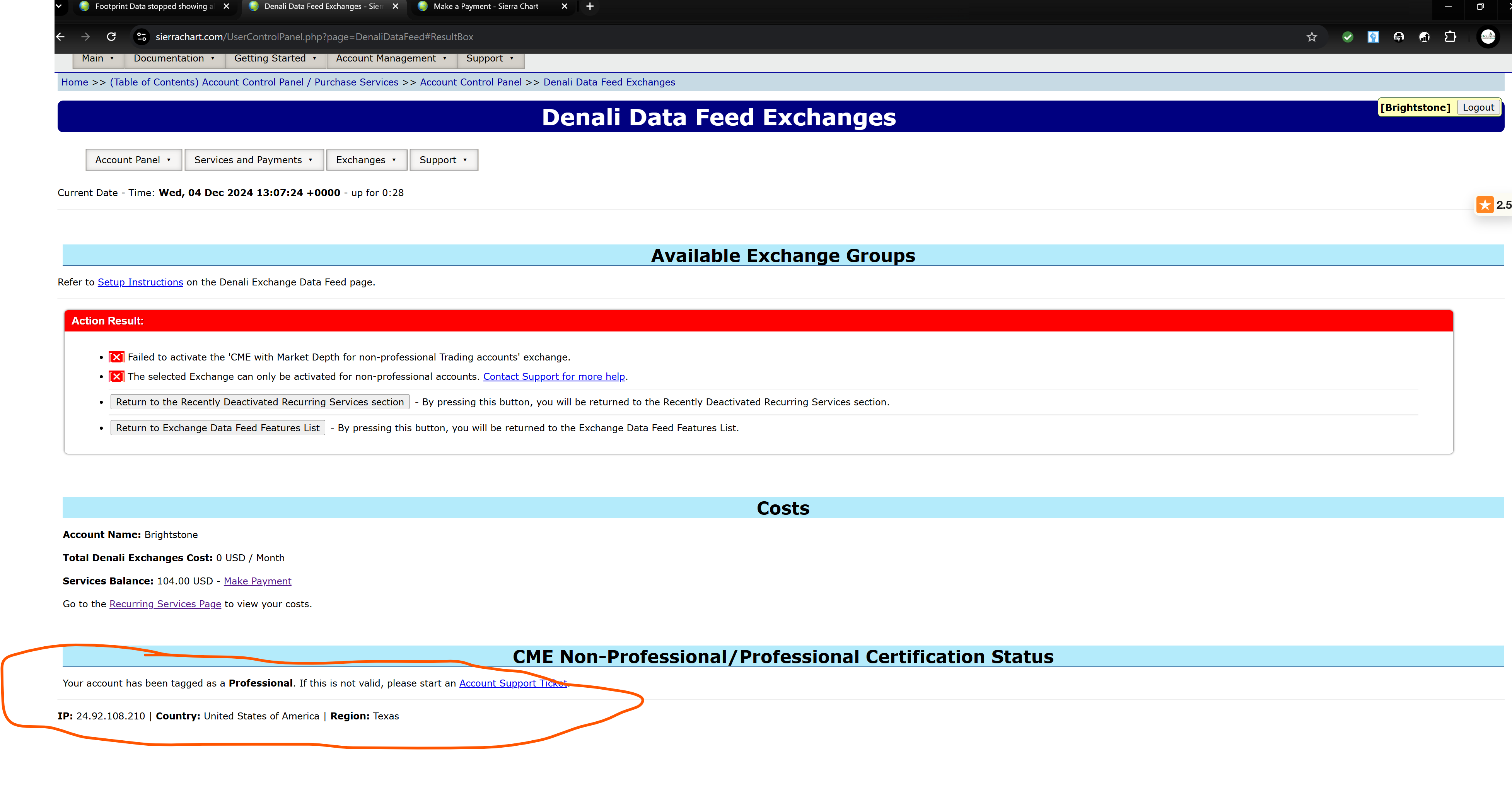 Sorry, we missed the fact that you had activated the "CME with Market Depth for non-professional Trading accounts". It's a long story on how we missed it, but part of it was that you did not pay for it since it was the first month you had activated it, and we were looking through your transactions and did not see any exchange payments. Anyway, it did not renew on December 1, 2024 because your agreements were not correct. Please redo the "Uniform Subscriber Agreement" at the following link and be sure to enter "Interactive Brokers" for the "Clearing Firm" and enter your Interactive Brokers Account Number: https://www.sierrachart.com/UserControlPanel.php?page=ExchangeAgreements Post back in this thread when you have completed the agreements so we can review them for you. For the most reliable, advanced, and zero cost futures order routing, use the Teton service: Sierra Chart Teton Futures Order Routing |