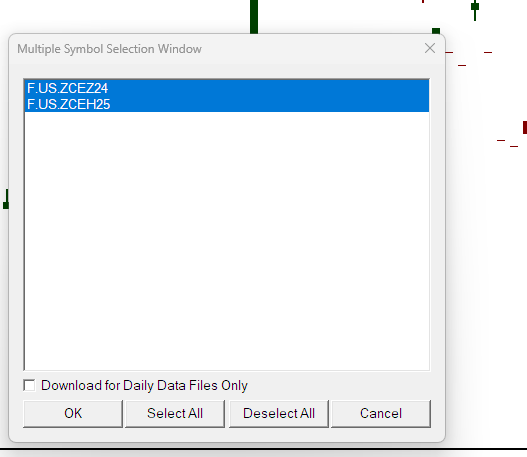 That is fine that you only have those two contracts. Select them both and select the OK button to redownload the data for both of those contracts. If you are still not getting the data that looks like what we showed in our image, then we would need to get your chart so we can see if there is some other reason for what you are seeing. Follow these instructions to get us your chart: Support Board Posting Information: Providing Chartbook with Only a Single Chart For the most reliable, advanced, and zero cost futures order routing, use the Teton service: Sierra Chart Teton Futures Order Routing |