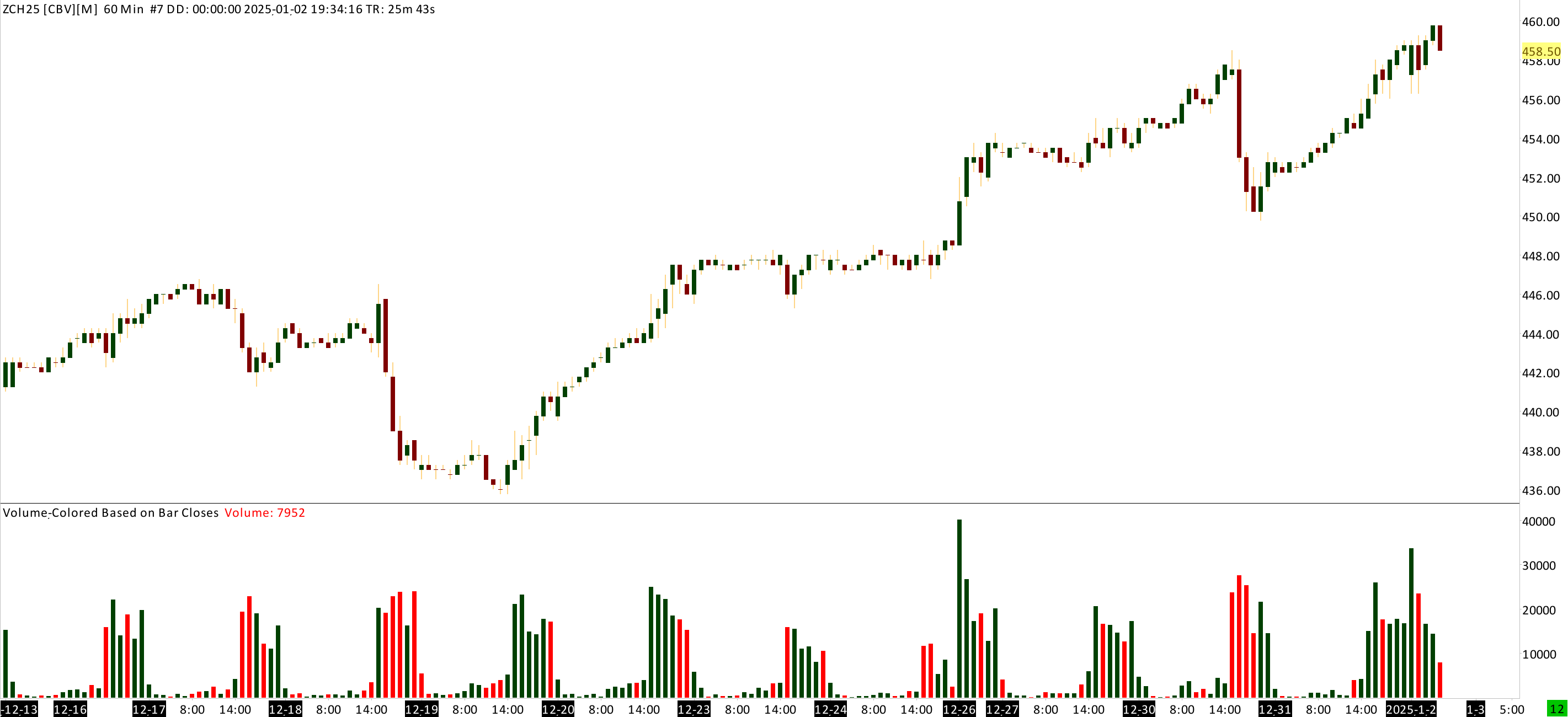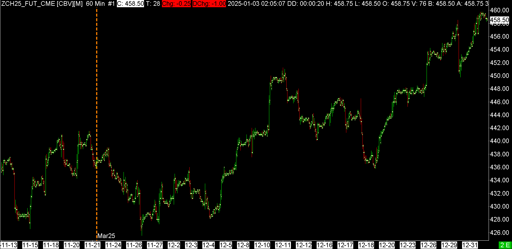 Disable custom symbol settings: Global Symbol Settings: Disabling Custom Symbol Settings Did you change the rollover rule for corn? The rollover date is wrong in your chart. It should be in November: https://www.sierrachart.com/image.php?Image=1735887934549.png Sierra Chart Support - Engineering Level Your definitive source for support. Other responses are from users. Try to keep your questions brief and to the point. Be aware of support policy: https://www.sierrachart.com/index.php?l=PostingInformation.php#GeneralInformation For the most reliable, advanced, and zero cost futures order routing, use the Teton service: Sierra Chart Teton Futures Order Routing Date Time Of Last Edit: 2025-01-03 07:06:17