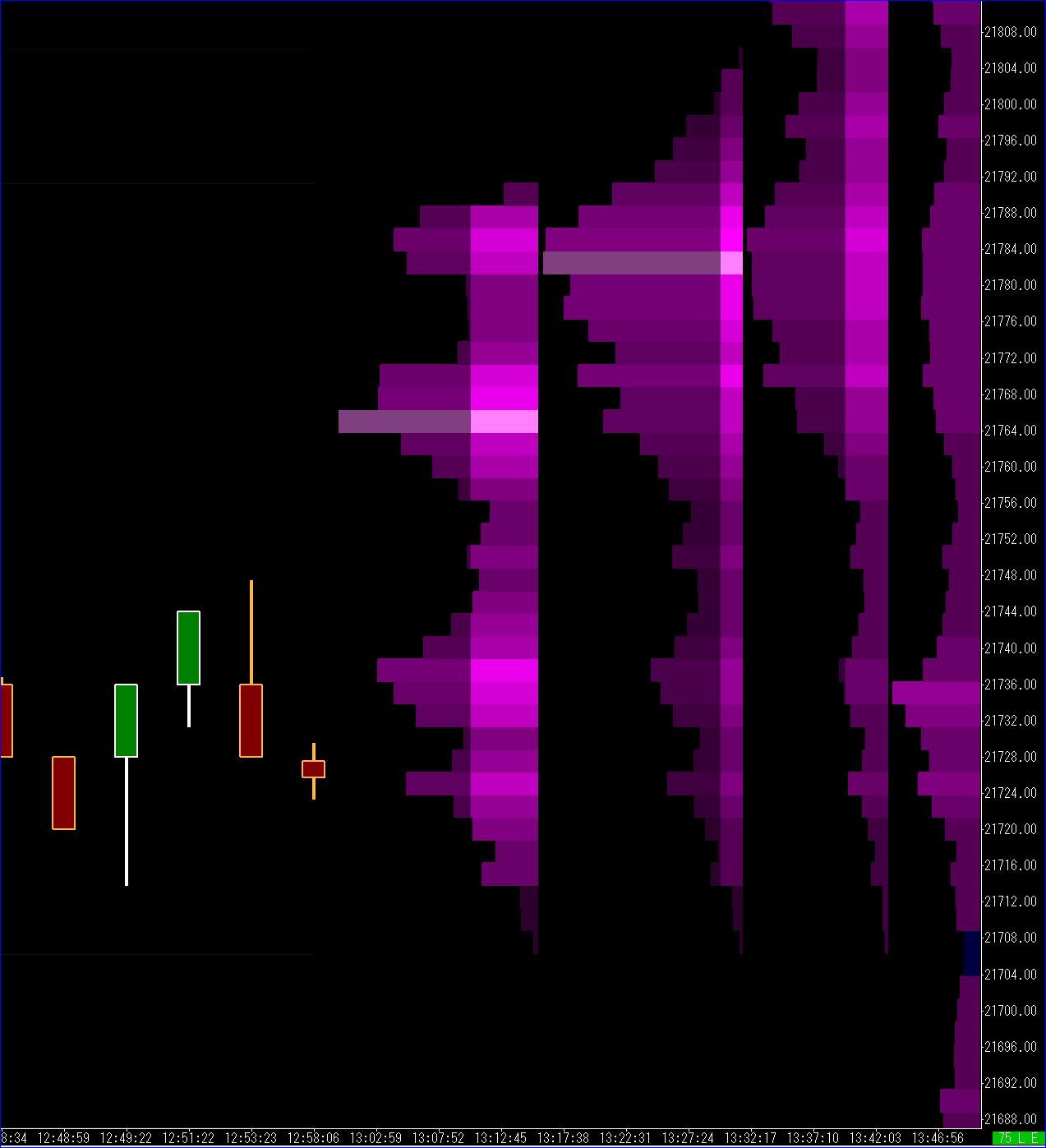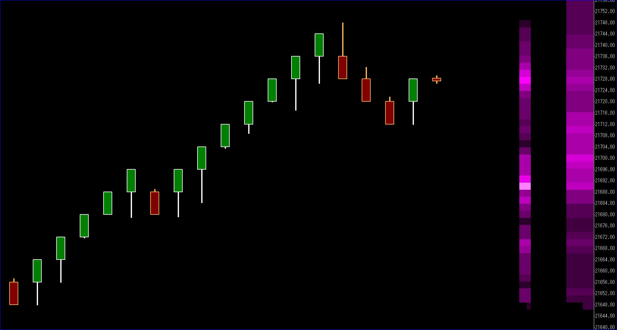 Those are the basic volume profiles from the Volume by Price study. In this example, it's Total Volume colorized from a bright pink POC to dark pink or black. It could also be any of the bid/ask combinations available in the Volume by Price study. I can see this providing a much cleaner chart without all the horizontal HVN and LVN lines. See attached, bright pink areas are HVNs and black areas are LVNs.