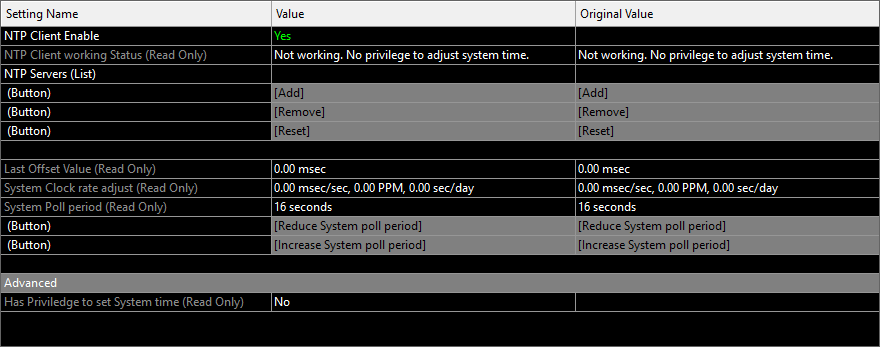 I have tried to use the NTP setting but in: NTP Client working Status (read only) it states: Not working. No privilege to adjust system time. Tried to find something about this in the documentation but couldn't. Can you have a look at this again please? Thank you. |