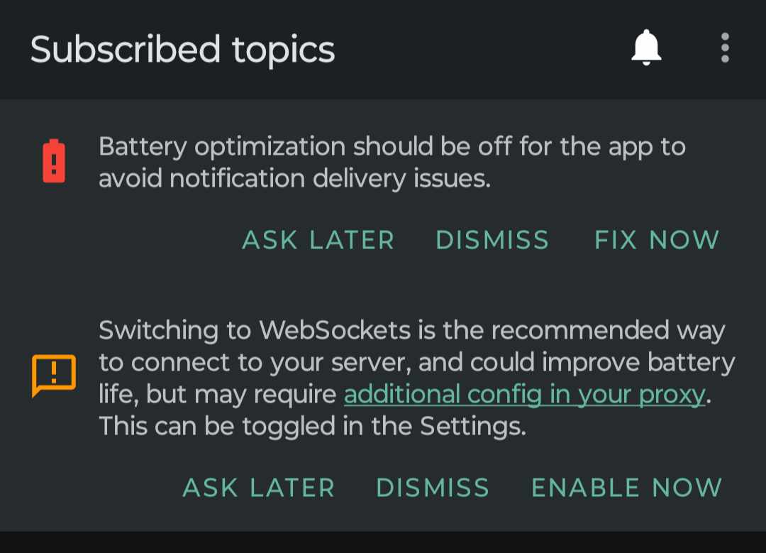 When using the ntfy app, if you do not receive automatic updates and have to do a manual refresh by pulling down the screen that shows the list of messages, then go back to the main home screen of the ntfy app, that shows the notification topic you are subscribed to. See if it says "reconnecting" underneath. If so, that is the reason automatic updates are not occurring. We have seen this. Next time it occurs we will troubleshoot why this is happening. Sierra Chart Support - Engineering Level Your definitive source for support. Other responses are from users. Try to keep your questions brief and to the point. Be aware of support policy: https://www.sierrachart.com/index.php?l=PostingInformation.php#GeneralInformation For the most reliable, advanced, and zero cost futures order routing, use the Teton service: Sierra Chart Teton Futures Order Routing Date Time Of Last Edit: 2025-03-28 19:41:31