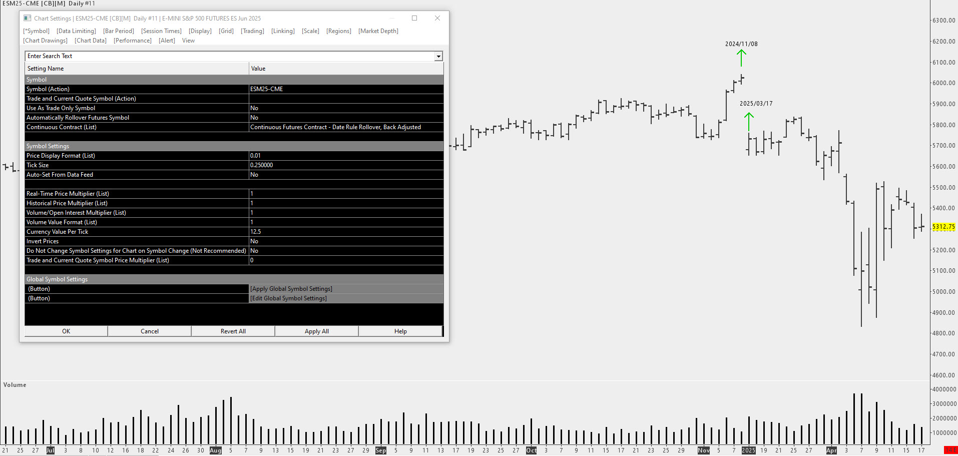 For now, I’m using SC DATA. I will activate real-time data via Denali starting from May 1st. Now, please help me set up the attached chart so I can view the continuous ES contract instead of switching manually between H and M contracts. I hope I was clear? |