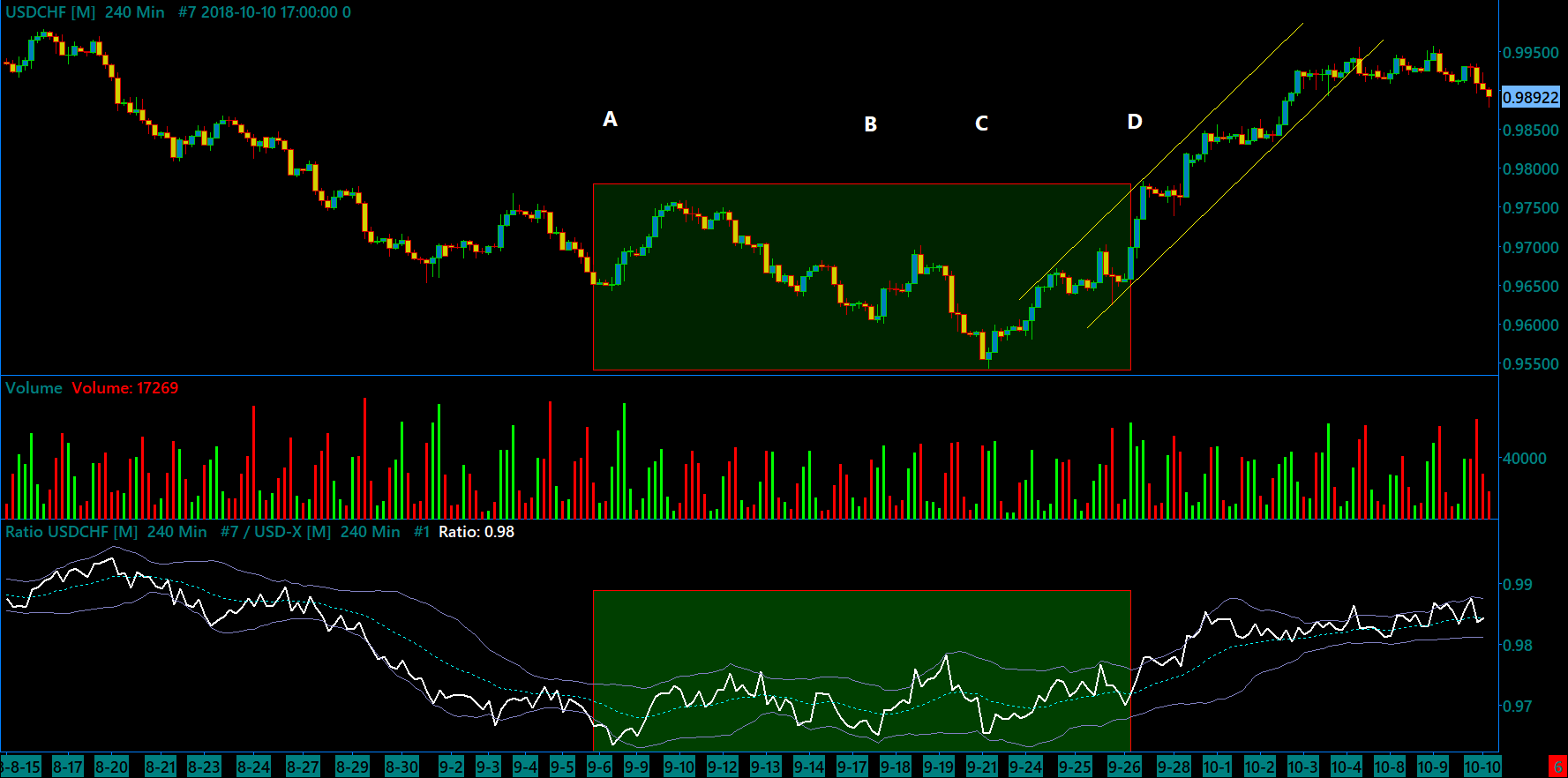 USDCHF 4 HR chart with Relative Strength vs the USD index in the bottom pane. Note following A the downtrend in price continues but the RS starts going sideways. At B price makes a substantive low vs A but RS makes a higher low vs A. At C price makes a substantive low against B while RS makes a higher low vs B. I haven't attached the chart but between C and D the USD index and CHF index are trending opposite each other and the DFP shows the majority of currencies weak against the USD and strong against the CHF. And of course during this time the USDCHF RS is showing strength against the USD index as per this chart. What follows is a nice uptrend. Note also how RS gives early warnings of the ends both of the trends on this chart. BTW, just to be clear, the label in the RS pane says "USD-X" but the RS is against the decorrelated USD index. http://www.sierrachart.com/image.php?Image=1544269051982.png Date Time Of Last Edit: 2018-12-08 13:16:05
