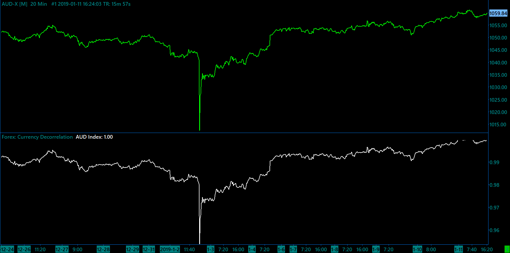 Hi Brett. I'm a bit confused. I compared the AUD-X and USD-X to your corresponding indexes on the weekly and 20-min charts and they appear to be exactly the same. I've attached the 20-min AUD. Shouldn't there be some differences? Am I misunderstanding something? http://www.sierrachart.com/image.php?Image=1547241847908.png |
