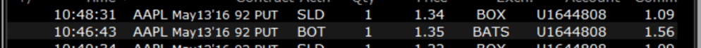 Per your request, bought to open symbol AAPL-OPT-20160513-92-P-100-USD @ 10:48:31 AM PST. Attached API Log, TWS Trade Log & Account Window screenshot. Also for your reference I attached the corresponding SC Trade Activity Log. Thanks, Adam Date Time Of Last Edit: 2016-05-06 18:14:19