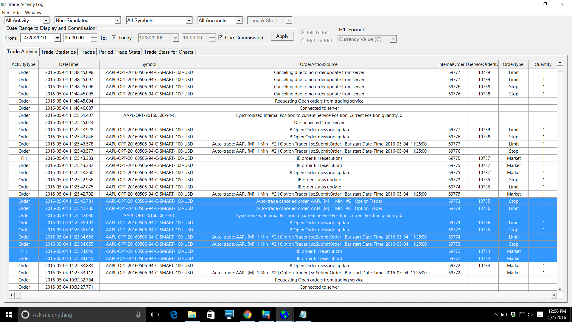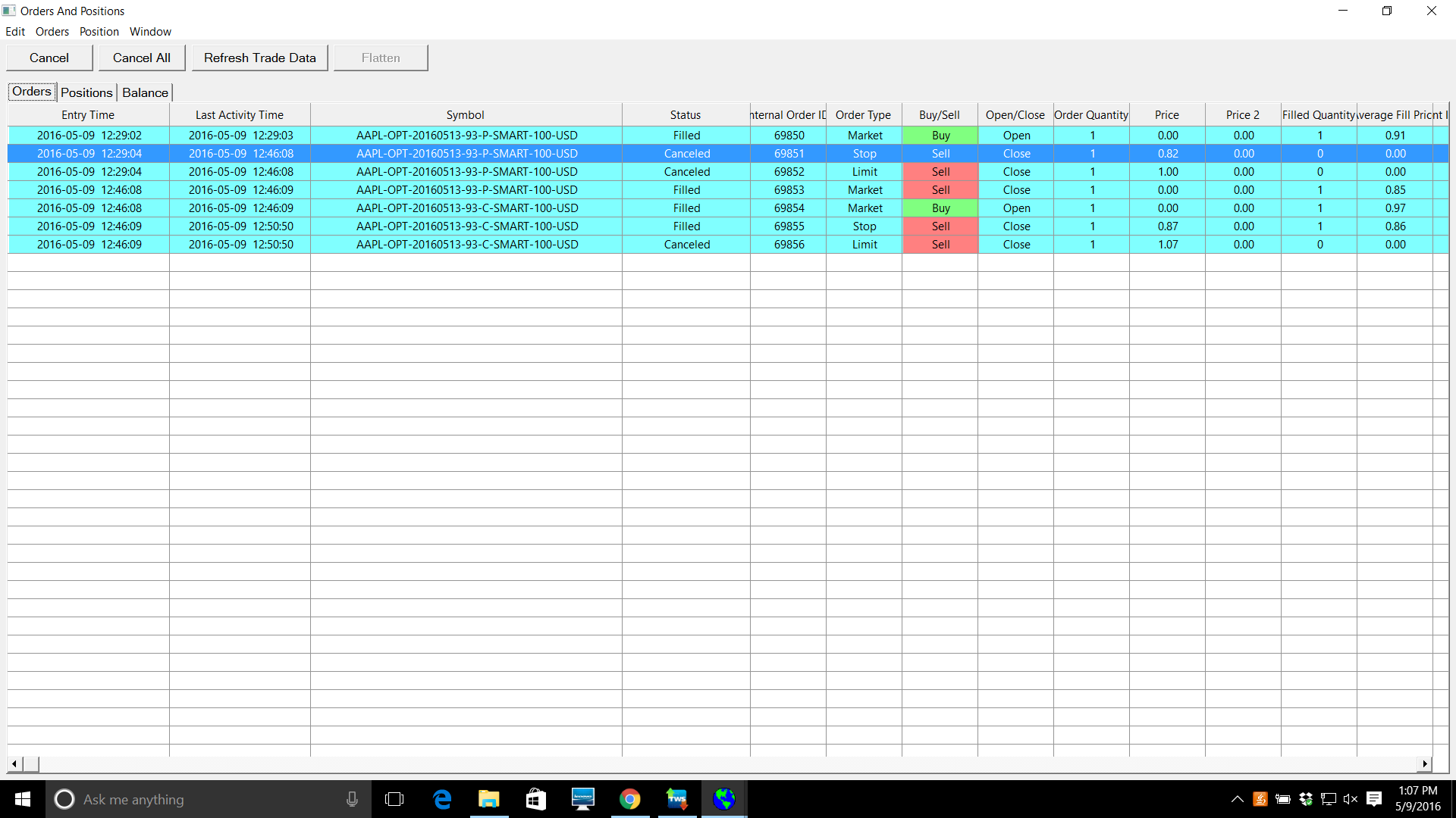 Thanks. Updated to newest pre-release 1409. 2nd day in a row no issues have come about. Will test again tomorrow morning. Still wanted to get information to you as I know you've added logging. Sierra Chart Trade Activity Log file attached. Symbol - AAPL-OPT-20160513-94-C-SMART-100-USD & AAPL-OPT-20160513-93-P-SMART-100-USD Time - 08:49:20:940 - 09:01:31:174 Time Zone - PST Also I got this from IB Support. Your log files have been received and reviewed. The logs do show the cancel order requests being made by Sierra Charts on the problematic day 05/04. They also show that Sierra charts made a portfolio subscription request on 05/09 which resulted in streaming portfolio data being continuously returned on 05/09, but there is not such a request from the log section provided for 05/04. Presumably, the Sierra Charts software is interpreting the absence of data as evidence that there are no portfolio changes occurring, and this may be a source of issue. To investigate further, can you please upload the complete log file from 05/04? If it is larger than 15 MB it will have to be zipped and emailed to api@interactivebrok ers.com. Date Time Of Last Edit: 2016-05-10 17:21:20