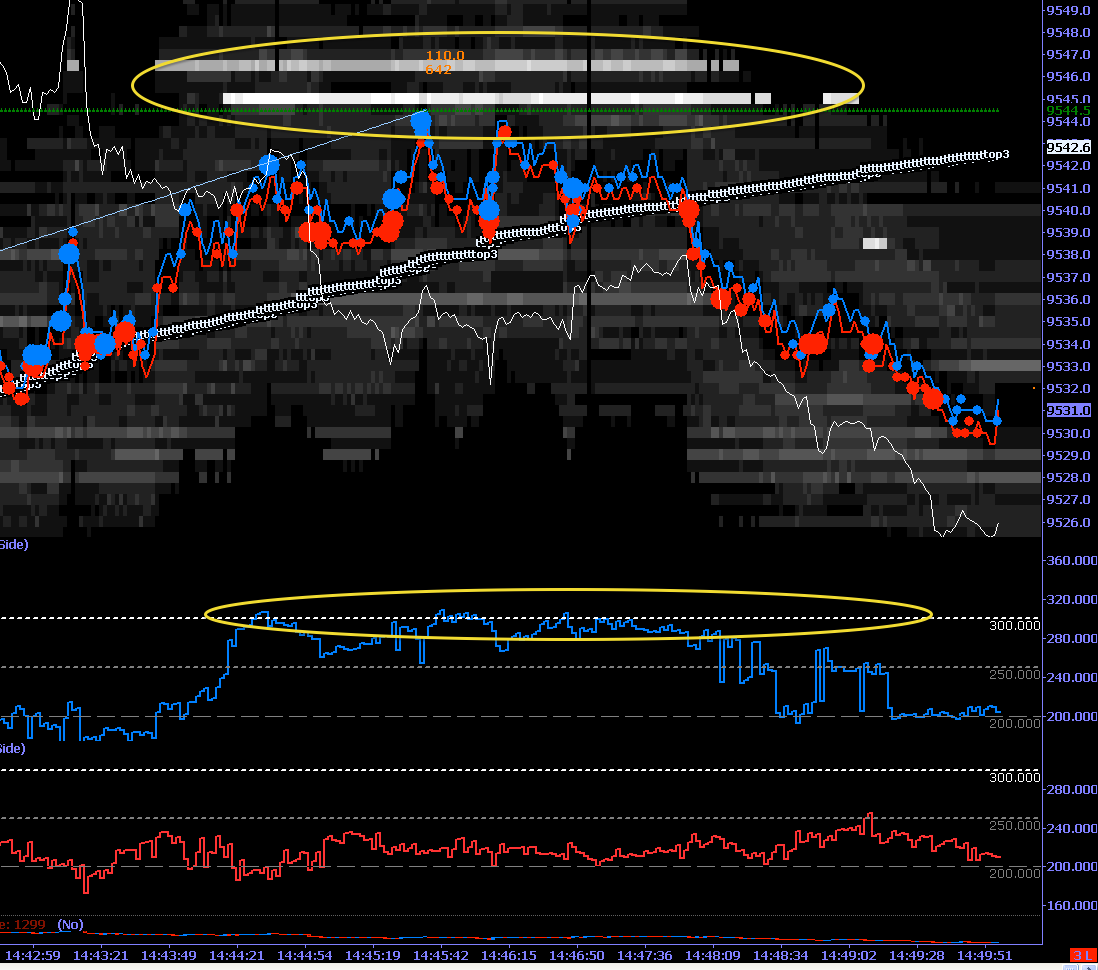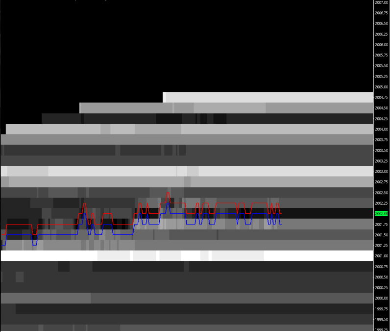 The trade dots feature mentioned above would also be great. One of the reasons is to see where there is a large "collision" with resting paper/liquidity, shown where there is a big circle at a very bright area that has been present for some considerable time. As mentioned above, it is much more useful if the trade dots/circles have a diameter that reflects the actual trade size rather than a one sized dot fits all. Another idea would be to have a shortcut hotkey to turn off and on the depth brightness bands so you could for the majority of the time have a clean chart and occasionally hit that hotkey to see where resting liquidity was in relation to what else is on your chart. That way you could get the best of both Sierra and Bookmap without having to take your eyes off the chart you were watching. |
