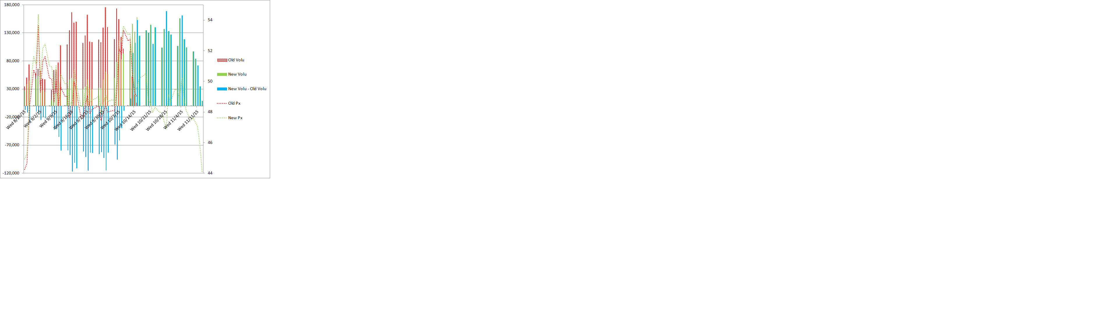 Ok thanks, clearly it's not urgent. I wrote my own volume-based rollover algorithm for backtesting and was just using your values to check against. It's a minor inconvenience that my results disagree with your charts at times. I'm surprised though because I didn't think a volume-based rollover rule would need to change over time since it's not something set by an exchange. If you compare the contracts CBX15/CBZ15 side by side (attached) then it's pretty clear that the volume shifts between them around 10/12/15 and I would thing the algorithm should detect that. Having the roll dates out of sequence and skipping a contract on the chart just looks odd. |