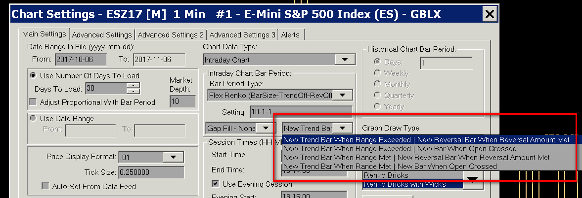Version 1637 is now released. See the attachment for the new setting. Hopefully, it is self-explanatory but detailed documentation will come. When creating a new bar when the current Renko bar open is crossed, that is when it it is a complete Renko bar only. Otherwise, a new bar would not be started. Sierra Chart Support - Engineering Level Your definitive source for support. Other responses are from users. Try to keep your questions brief and to the point. Be aware of support policy: https://www.sierrachart.com/index.php?l=PostingInformation.php#GeneralInformation For the most reliable, advanced, and zero cost futures order routing, *change* to the Teton service: Sierra Chart Teton Futures Order Routing Date Time Of Last Edit: 2017-11-06 08:40:13