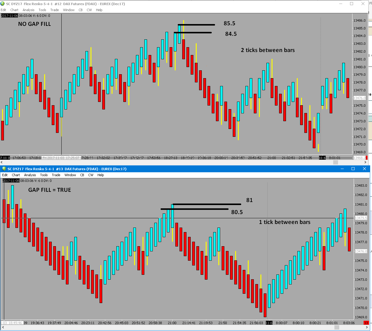 On first chart gapfill=false, on second chart gapfill= true. Setting is "New trade bar when exceeded, new reversal bar when met" Sierra Chart Support - Engineering Level Your definitive source for support. Other responses are from users. Try to keep your questions brief and to the point. Be aware of support policy: https://www.sierrachart.com/index.php?l=PostingInformation.php#GeneralInformation For the most reliable, advanced, and zero cost futures order routing, *change* to the Teton service: Sierra Chart Teton Futures Order Routing Date Time Of Last Edit: 2017-11-07 18:19:39