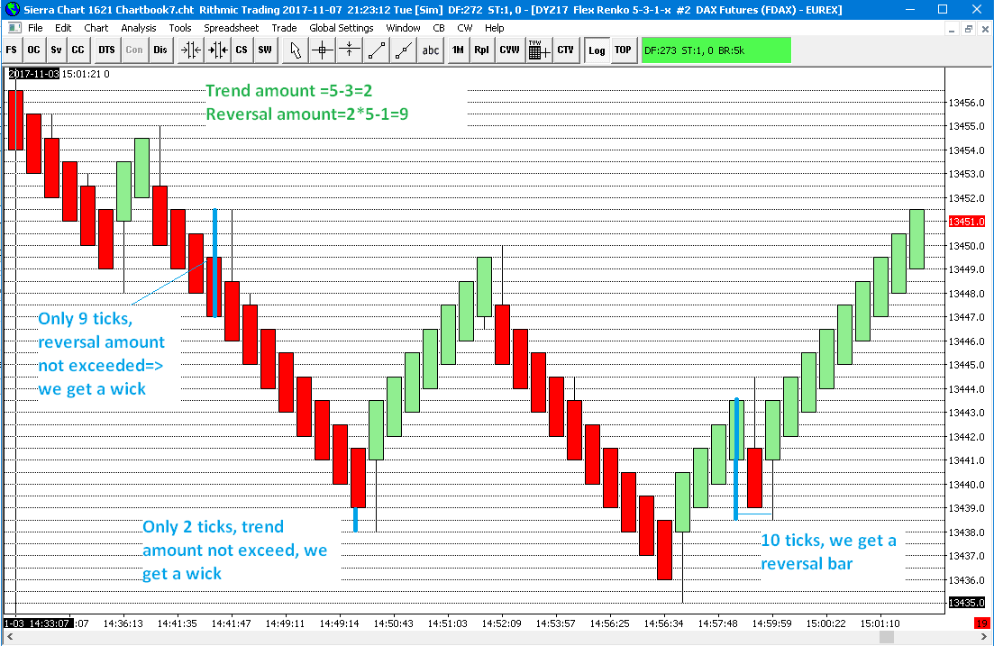 On the 1621 5-4-1-x, the reversal candle will be completed only after 11 ticks. OK, we think we understand what you are trying to say now. Disregard post #38.There will be a reversal bar after 10 ticks and with another 1 tick movement in that same direction, a new bar will be started. Sierra Chart Support - Engineering Level Your definitive source for support. Other responses are from users. Try to keep your questions brief and to the point. Be aware of support policy: https://www.sierrachart.com/index.php?l=PostingInformation.php#GeneralInformation For the most reliable, advanced, and zero cost futures order routing, *change* to the Teton service: Sierra Chart Teton Futures Order Routing Date Time Of Last Edit: 2017-11-06 23:11:22