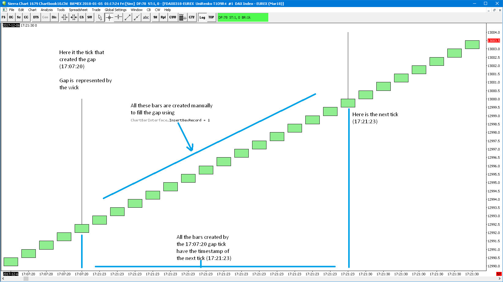 It seems ChartBarInterface.InsertNewRecord = 1; is missing in the sample. The chart is starting to add bars, but still some issues. I see the bars created in IsInsertFileRecordsProcessing being sent once, so they arrive in IsDeterminingIfShouldStartNewBar, and then in IsFinalProcessingAfterNewOrCurrentBar, but then there is a problem, IsFinalProcessingAfterNewOrCurrentBar is sent one more time instead of IsInsertFileRecordsProcessing , so the bar splitting process can't continue. So if we add no bar, we have IDISNB IFPANOCB IIFRP IDISNB IFPANOCB IIFRP IDISNB IFPANOCB IIFRP but if we create a new bar in the underlined IIFRP, we get the sequence IDISNB IFPANOCB IIFRP IDISNB IFPANOCB IFPANOCB IDISNB IFPANOCB IIFRP IDISNB IFPANOCB IIFRP but I think we may be close.. Date Time Of Last Edit: 2017-12-27 23:36:42