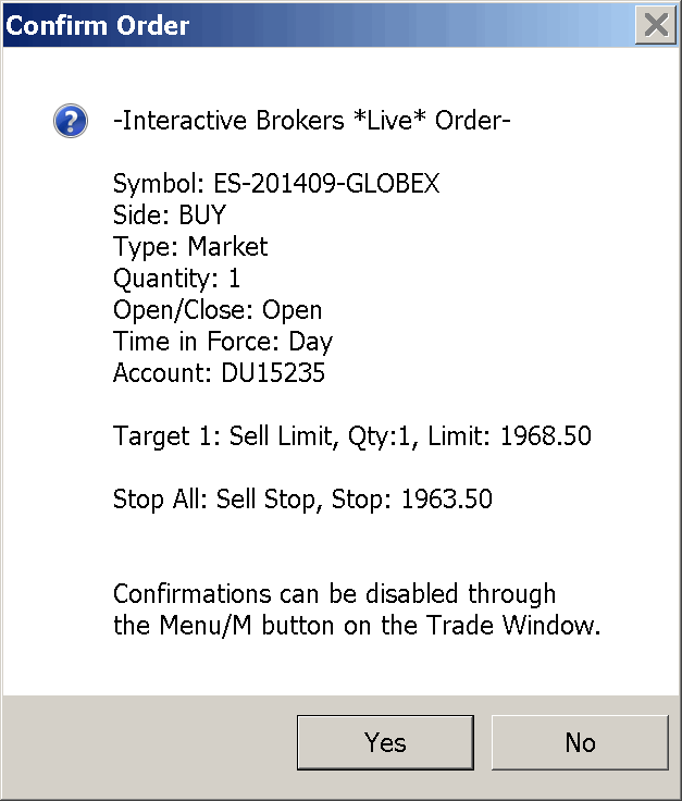 We have just done a test now using the standard IB Demo account (edemo). The bracket order was submitted and accepted without a problem. Attached is the order confirmation window. You will notice that there is no warning about the parent order needing to fill before the child orders will be sent and no OCO warning. Here is the Trade Activity Log: ActivityType DateTime Symbol OrderActionSource OrderStatus InternalOrderID ServiceOrderID OrderType Quantity BuySell Price Price2 PositionQuantity FillPrice FilledQuantity TradeAccount OpenClose ParentInternalOrderID FillExecutionServiceID