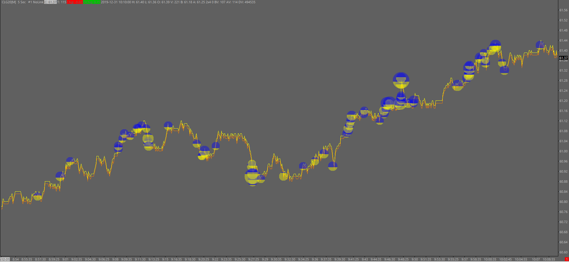 As a vague substitute, using color and shade rather than graphical size, look at bid-ask bars for chart style. - they become a darker shade with more volume, - they are split by color for ratio bid/offer. But hard to read. To take them further, would be nice of user could: - edit % level to determine volume v.s. bar shading - flip the colors (eg, green on top or red on top. For my mind, bids hit color should be at the bottom of the bar. Offer taken at the top of the bar) You can also use color + shading intensity on customized skinny numbers bars to reflect similar data interpretations of volume and bid/offer ratio. The customization within SC numbers bars is a very deep and rewarding rabbit hole. |