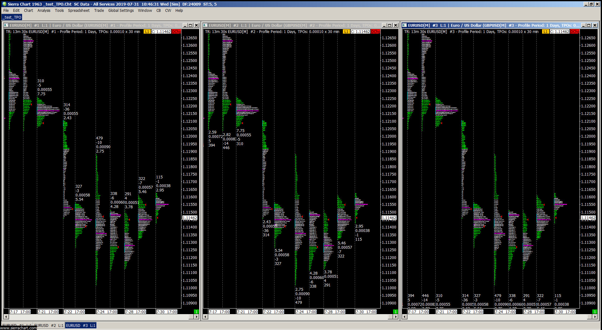 With regards to post #43: Just set the following Inputs for the TPO study: - Profile Time Period Length: 1 - Profile Time Period Length Unit: Weeks - Number of TPO Profile Periods: Multiple Periods Based on Fixed Time Refer to the documentation for these Inputs starting here: Time Price Opportunity (TPO) Profile Charts: Profile Time Period Length And refer to: Time Price Opportunity (TPO) Profile Charts: Viewing TPO Profile Text Information Sierra Chart Support - Engineering Level Your definitive source for support. Other responses are from users. Try to keep your questions brief and to the point. Be aware of support policy: https://www.sierrachart.com/index.php?l=PostingInformation.php#GeneralInformation For the most reliable, advanced, and zero cost futures order routing, *change* to the Teton service: Sierra Chart Teton Futures Order Routing Date Time Of Last Edit: 2020-02-20 10:15:09