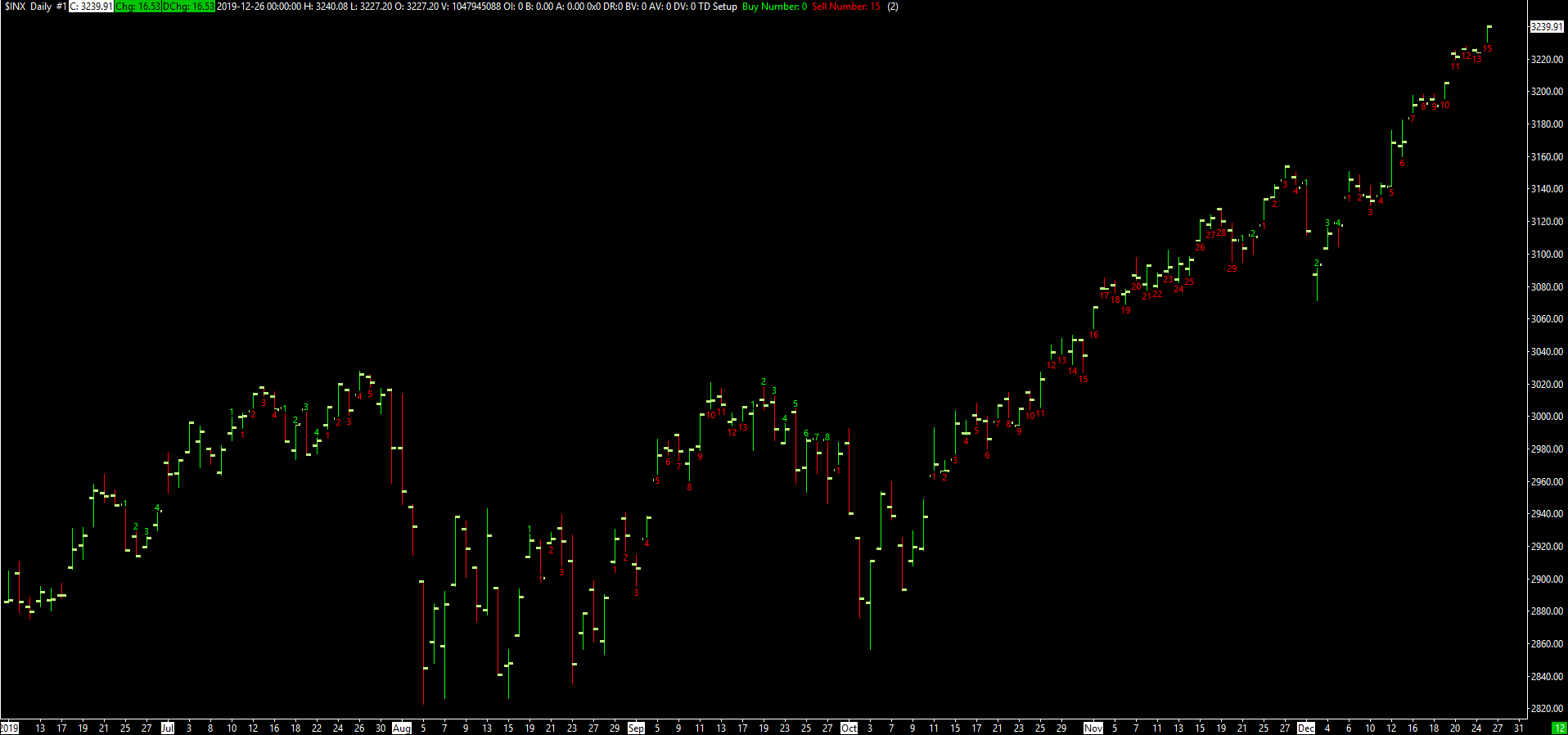 I have finished coding TD Setup (aka Trading the Nines). I apologize for the delay, and I appreciate your efforts to help me via email. The delay was not due to a misunderstanding of the indicator, but rather to my own inexperience with ACSIL. I spent a fair bit of time reading the documentation for this language. I have some enhancements to make to this study, but the basic framework is in place and you can start using it. Attached to this post are the source code, the .dll file (place this in Sierra Chart >> Data, then find the study TD Setup in Sierra Chart under Analysis >> Studies >> Add Custom Studies), and the chartbook that I tested the study on. The test was successful. By default the study places green numbers above all bars that satisfy the criteria for a valid buy setup, and red numbers below all bars that satisfy the criteria for a valid sell setup. The number of consecutively labeled bars may be less than, equal to, or greater than 9. Once the number reaches 9, this indicates a signal to either buy or sell. |