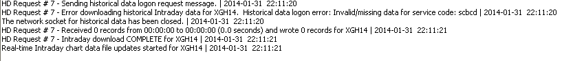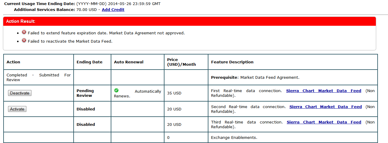 The problem is your Market Data Feed Agreement has not been approved yet. We will check on it. We checked on it and it was not approved and we have given the reasons why. Please see the email message about this and reply to us. Sierra Chart Support - Engineering Level Your definitive source for support. Other responses are from users. Try to keep your questions brief and to the point. Be aware of support policy: https://www.sierrachart.com/index.php?l=PostingInformation.php#GeneralInformation For the most reliable, advanced, and zero cost futures order routing, *change* to the Teton service: Sierra Chart Teton Futures Order Routing Date Time Of Last Edit: 2014-02-03 18:49:22