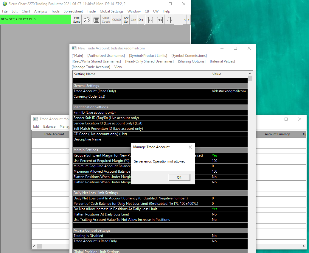 Regarding the duplicate functionality: 2258 supports duplicating a trade account. Trade >> Trade Account Monitor. Select the trade account in the list and then select Manage >> Duplicate Trade Account. This actually was not released. It was only part of our debug builds. The menu command will do nothing at this time in the versions released to this date.By duplicating a trade account, you can use existing accounts as a template. And we subsequently have realized that this functionality requires further implementation to be fully functional. It should be out later this week. Sierra Chart Support - Engineering Level Your definitive source for support. Other responses are from users. Try to keep your questions brief and to the point. Be aware of support policy: https://www.sierrachart.com/index.php?l=PostingInformation.php#GeneralInformation For the most reliable, advanced, and zero cost futures order routing, use the Teton service: Sierra Chart Teton Futures Order Routing Date Time Of Last Edit: 2021-05-29 21:43:46