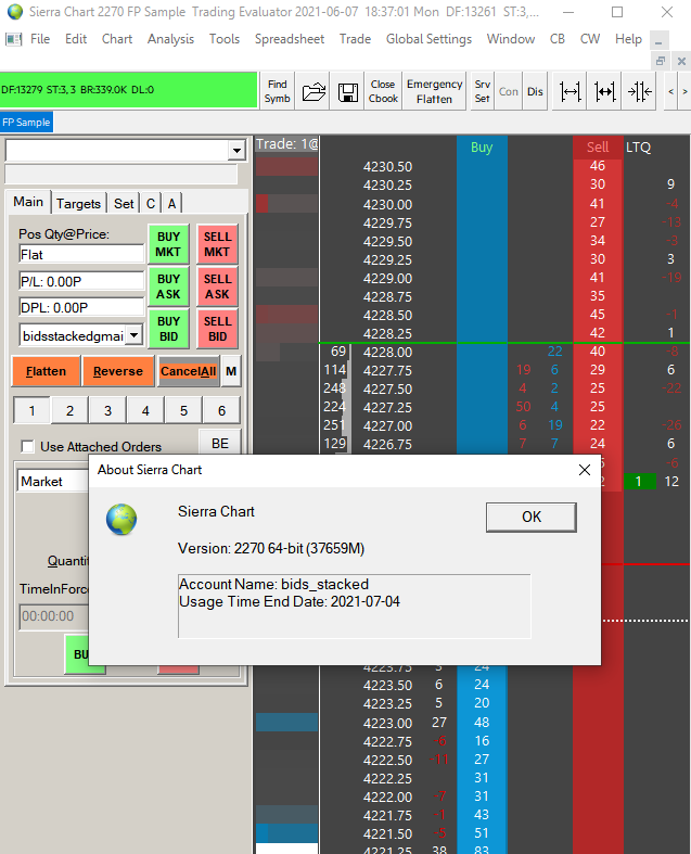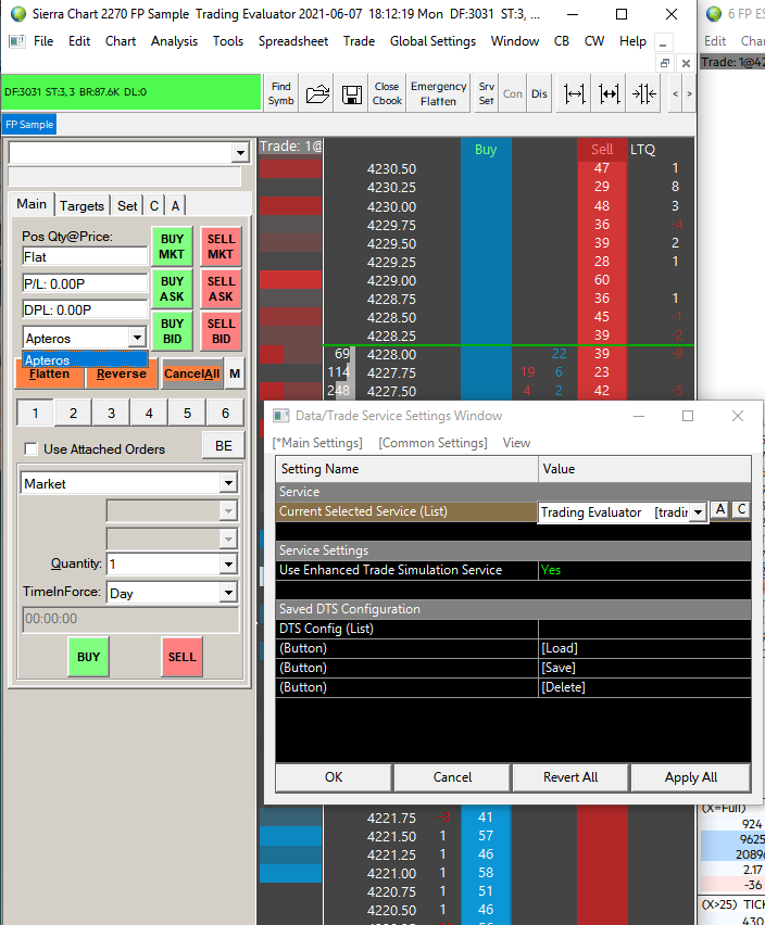 The new enhanced Simulated Trading Service which is documented here: Simulated Futures Trading Service has been released. The old service will be discontinued June 19, 2021. To use the new service, if you are not already using it, follow the instructions below: 1. Update Sierra Chart to the latest release. Instructions: Software Download: Fast Update 2. After the update, in your installation of Sierra Chart which you use with this simulated trading service, select "Global Settings >> Data/Trade Service Settings". 3. The "Current Selected Service" needs to be set to "Trading Evaluator" or "Trading Evaluator-Delayed". 4. Set the "Service Settings >> Use Enhanced Trade Simulation Service" to Yes. 5. Press OK. 6. Reconnect to the data feed: File Menu: Procedure to Reconnect to the Data and Trade Servers 7. Create your trading account as documented here if it does not exist on the new service: Simulated Futures Trading Service: Setup Instructions It will not be possible to connect to the old service, after June 19, 2021. All of the order fill history has been copied over as of this time to the new service from the old service. This is why it is important to transition to the new service, as soon as possible, and not do any trading on the old service any longer because any trading you do on the old service, as of 2021-06-05, the order fill history will not be on the new service. Sierra Chart Support - Engineering Level Your definitive source for support. Other responses are from users. Try to keep your questions brief and to the point. Be aware of support policy: https://www.sierrachart.com/index.php?l=PostingInformation.php#GeneralInformation For the most reliable, advanced, and zero cost futures order routing, use the Teton service: Sierra Chart Teton Futures Order Routing Date Time Of Last Edit: 2021-06-05 02:48:34