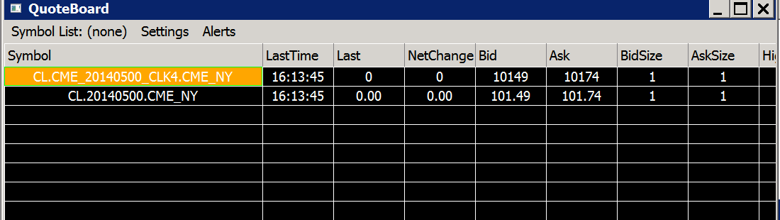 Thnk you! Yes, clear log is OK. Bat chat with symbols format CL.20140500.CME_NY gives me last value price 99.41(3-29-2014)(in some charts - 99.38 reason).This last value prices apply to contract CLJ14 (f.e. -> http://www.dormantrading.com/TraderTools/quotes.htm?&page=ccharts&sym=CLJ14&overlay=&sp=&nasdaq=&dow=) If you are using a chart format CL.CME_20140500_CLK4.CME_NY, we get right to the last price 101.67(3-29-2014) for contract CLK14. So, if you use a new recording format, then get the data of the old contract. And if you use an old recording format, then we get the correct data of the new contract, but then the order in Sierra Chart fixed on the old contract. But are sent to the host on a new contract(?). So like my result. You understand that by using the new recording format can not put a orders - not all data. Current version Sierra Chart is 1114. And the same failure occurs on version 1110. What is the reason? What am I doing wrong? Someone turns to trade oil in Sierra Charts + CTS T4 and how he does it? |