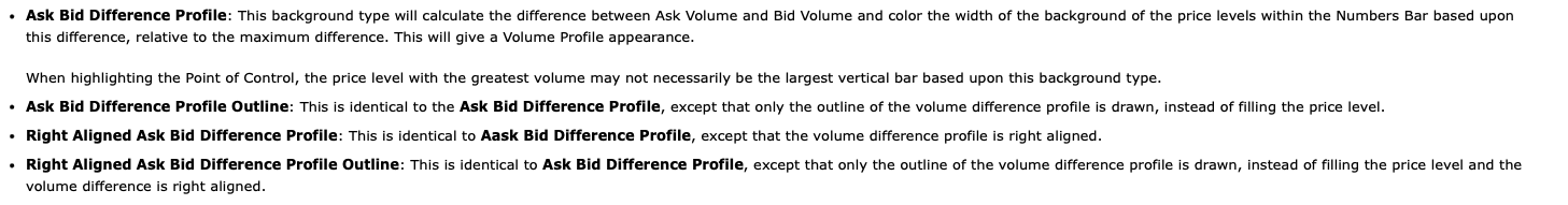 Thanks for your response John, What I'm looking for, and I believe others in the tread, is a Number Bars Profile Background Type based on Ask Vol Bid Vol Diff Diagonal Bid Side. Just like Volume Text can have a Volume Profile (Across All Columns) Background Type, it would be great if the Ask Bid Diagonal text types could have their own Background Types (the most common/importation version of the calculation being the Ask Vol Bid Vol Diff Diagonal Bid Side, I believe). At the moment the closest option is the Ask Bid Difference Profile Background Type, which does not match the Diagonal text values. Thanks so much |