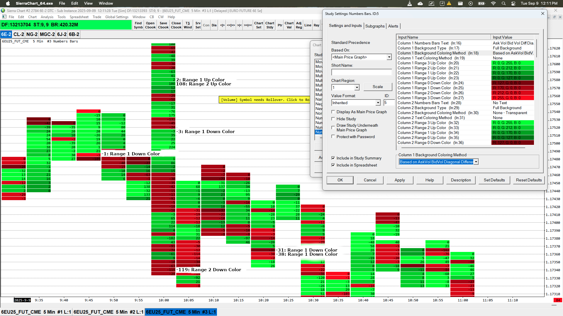 IMHO a Coloring Method for AV BV Diff Diagonal Bid Side (a diagonal delta calculation) would allow for coloring the negative and positive values separately, while also allowing for Percentage Compare Thresholds. In this scenario, all negative values are red, positive values are green. The Range 0/1/2/3 Up/Down colors are based on the Percentage/Actual Compare Thresholds (for example: dark green for 1, light green for 1000 - dark red for -1, light red for -1000). This is not all that dissimilar to the Coloring Method: Based on AskVol BidVol Diagonal Difference Percentage of Bar Range, except that this is obviously a different calculation, with different values to the diagonal delta that I think a lot of people use. I've attached a screenshot of a Number Bars chart with AV BV Diff Diagonal Bid Side, with a Full Background Background Type and a Coloring Method Based on AskVol BidVol Diagonal Difference Percentage of Bar Range. I've included annotation of what I think the Coloring Method should be. In the case of the AV BV Diff Diagonal Bid Side, aka Delta, being 0, the color could just be transparent. Thanks so much! Date Time Of Last Edit: 2025-09-09 16:33:46