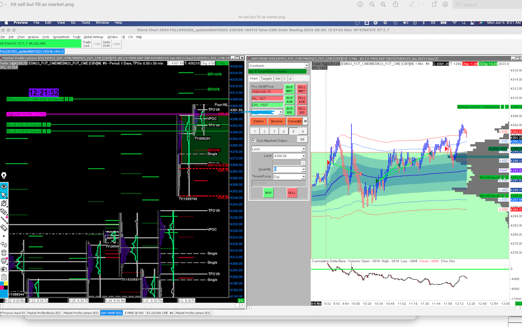 Regarding the issue of not seeing positions when using Interactive Brokers, the issue in your particular case is clear. You were using the wrong symbol. It needs to be exactly: MES-######-CME-USD Unless necessary, do not manually specify symbols when using Interactive Brokers and use the symbols only in File >> Find Symbol. On the attachment I sent you I put in a limit order at 4300 but it got fill at 4298 Market Check the Trade Activity Log and see exactly the order parameters of the order to try to get an understanding of the issue:Trade Activity Log: Viewing Historical Trade Activity Sierra Chart Support - Engineering Level Your definitive source for support. Other responses are from users. Try to keep your questions brief and to the point. Be aware of support policy: https://www.sierrachart.com/index.php?l=PostingInformation.php#GeneralInformation For the most reliable, advanced, and zero cost futures order routing, use the Teton service: Sierra Chart Teton Futures Order Routing Date Time Of Last Edit: 2023-06-06 08:33:17