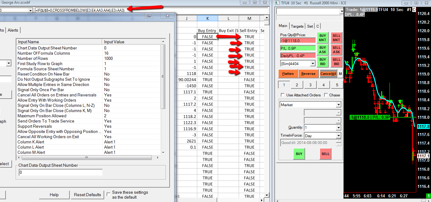 You get arrows on every bar when you are in a trade because the second half of the formula is active, the first is not. When flat, only the first half of the formula is active.It should be noted that when I flatten manually, and then reload and recalculate, everything looks as it should - the repeated historical fills go away, and the system waits for the next trade. As soon as I get into a trade, the signals start coming through each bar. Let me know what I might have out of order. Thanks again It should be noted that historical arrows, when flat, are based on the Close only. What happened intrabar is not revealed by the arrows. If you want to show the first-half-of-the-formula historical arrows when the second-half-of-the-formula is active, you'll need to use two other formula columns for the arrows, and set the Draw Style of the K(SG1) and M(SG3) to Hidden: O3 for up arrows: =IF(CROSSFROMBELOW(E3:E4,AA3:AA4),D3,0) P3 for down arrows: =IF(CROSSFROMABOVE(E3:E4,AA3:AA4),C3,0) Set the Draw Styles of O(SG5) and P(SG6) to Arrow Up and Arrow Down, respectively. Date Time Of Last Edit: 2014-08-05 14:09:12