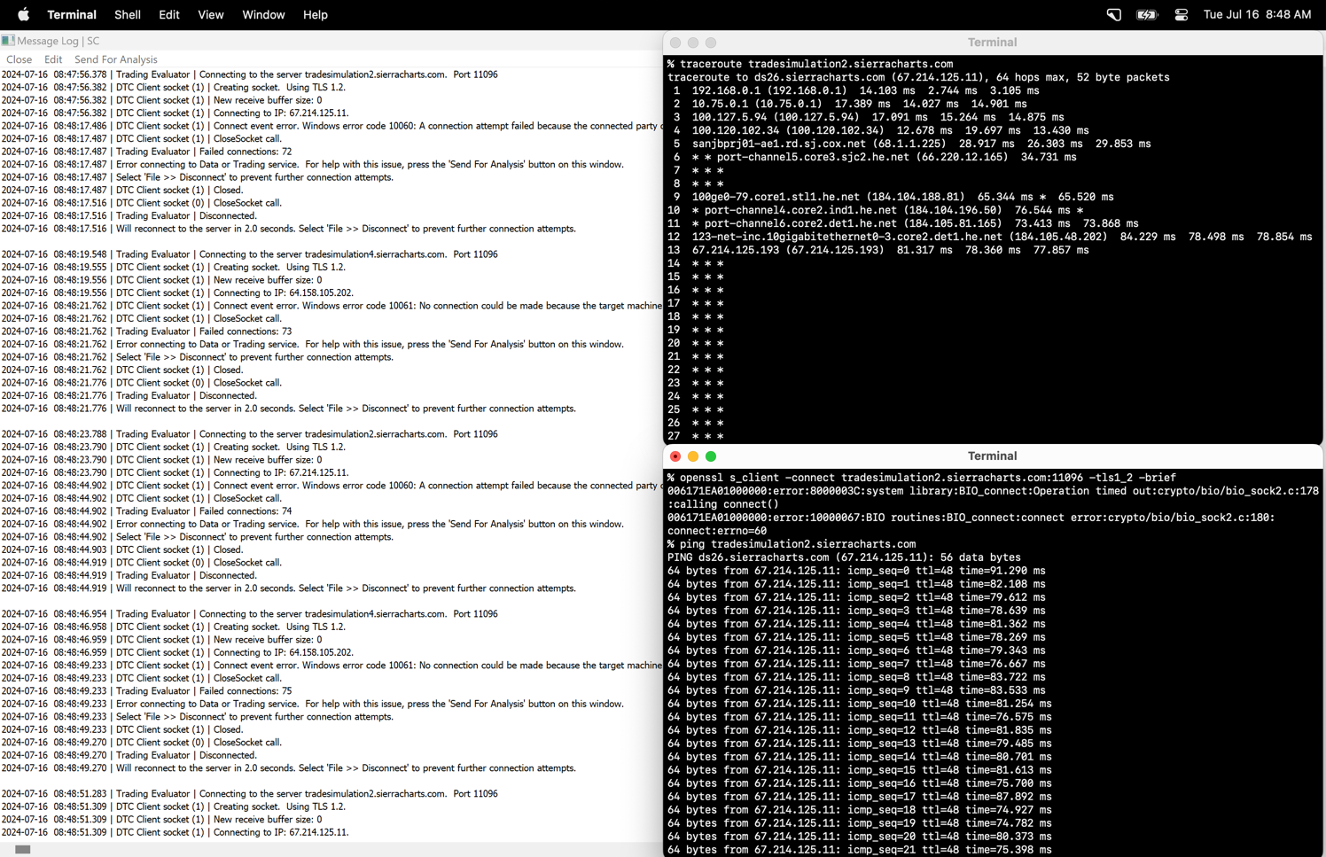 I'm in San Diego, CA and haven't been able to connect to rithmic since yesterday. I've updated to the latest sierra. I have a sub instance that seems to have connected to Denali I guess because the box is green, but the charts don't update and the main instance has the yellow Reconnect wait issue. Posting the trace info just in case it helps. I've sent an email to rithmic, but I'm not expecting a reply anytime soon. I realize this is a rithmic issue and not a sierra issue but I appreciate any help as I'm guessing they might pay more attention to your emails than mine. Please let me know if you need any other info. Thank you. Tracing route to ds28.sierracharts.com [67.214.125.5] over a maximum of 30 hops: 1 <1 ms <1 ms <1 ms dsldevice.attlocal.net [192.168.1.254] 2 3 ms 4 ms 2 ms 107-217-8-1.lightspeed.sndgca.sbcglobal.net [107.217.8.1] 3 2 ms 2 ms 4 ms 71.157.16.98 4 * * * Request timed out. 5 * * * Request timed out. 6 * * * Request timed out. 7 18 ms 9 ms 15 ms 32.130.25.175 8 15 ms 9 ms 7 ms ggr2.la2ca.ip.att.net [12.122.129.105] 9 13 ms 5 ms 7 ms ae7.mpr1.lax12.us.zip.zayo.com [64.125.12.153] 10 * * * Request timed out. 11 * * * Request timed out. 12 * * * Request timed out. 13 * * * Request timed out. 14 69 ms 62 ms 63 ms ae9.mpr1.cle2.us.zip.zayo.com [64.125.22.1] 15 74 ms 69 ms 67 ms ae11.mpr2.dtw3.us.zip.zayo.com [64.125.24.227] 16 64 ms 57 ms 59 ms 64.124.32.66.IDIA-385104-ZYO.zip.zayo.com [64.124.32.66] 17 63 ms 57 ms 55 ms 67.214.125.193 18 57 ms 60 ms 58 ms 67.214.125.5 Trace complete. Date Time Of Last Edit: 2024-07-16 19:18:45