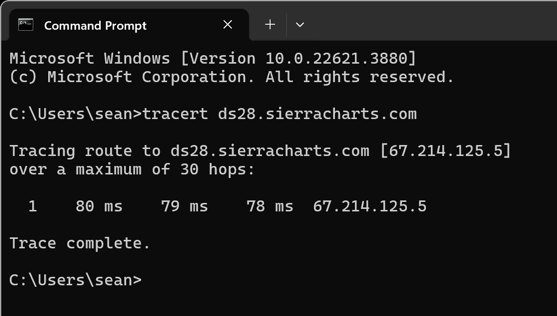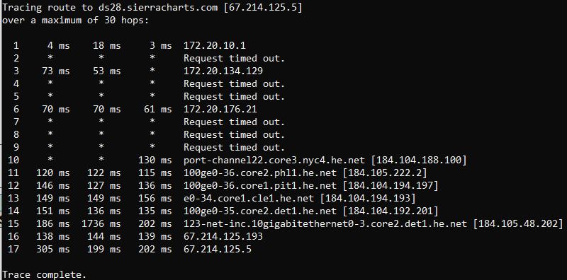 i just assumed that was the crummy summary output of windows11's tracert.. traditional traceroute: % traceroute -m30 ds28.sierracharts.com traceroute to ds28.sierracharts.com (67.214.125.5), 30 hops max, 52 byte packets 1 192.168.0.1 (192.168.0.1) 10.235 ms 3.531 ms 3.054 ms 2 10.75.0.1 (10.75.0.1) 13.725 ms 15.152 ms 21.338 ms 3 100.127.5.94 (100.127.5.94) 19.356 ms 13.465 ms 12.927 ms 4 100.120.102.34 (100.120.102.34) 12.901 ms 13.120 ms 12.315 ms 5 sanjbprj01-ae1.rd.sj.cox.net (68.1.1.225) 28.220 ms 31.453 ms 27.355 ms 6 * * port-channel5.core3.sjc2.he.net (66.220.12.165) 36.328 ms 7 * * * 8 * * * 9 100ge0-79.core1.stl1.he.net (184.104.188.81) 67.066 ms 59.963 ms 59.710 ms 10 port-channel4.core2.ind1.he.net (184.104.196.50) 66.131 ms * * 11 port-channel6.core2.det1.he.net (184.105.81.165) 74.876 ms 76.427 ms 72.744 ms 12 123-net-inc.10gigabitethernet0-3.core2.det1.he.net (184.105.48.202) 78.541 ms 78.188 ms 81.697 ms 13 67.214.125.193 (67.214.125.193) 94.008 ms 77.120 ms 79.702 ms 14 * * * 15 * * * 16 * * * 17 * * * 18 * * * 19 * * * 20 * * * 21 * * * 22 * * * 23 * * * 24 * * * 25 * * * 26 * * * 27 * * * 28 * * * 29 * * * 30 * * * % edit: oh i know why.. my windows machine is being virtualized with some sort of bridged networking Date Time Of Last Edit: 2024-07-16 16:29:19