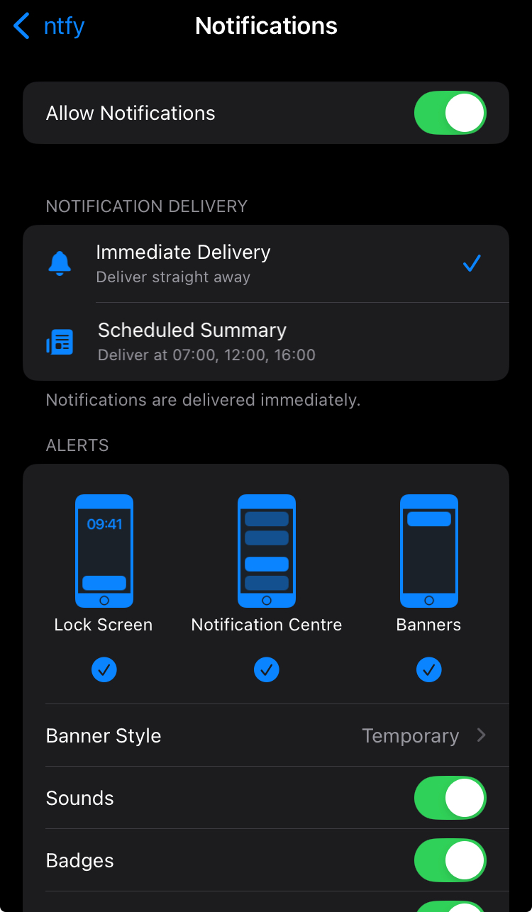 Under "Settings >> Notifications" Do you have notification summary enabled? If enabled is ntfy included in the summary? Try to disable notification summary if they are enabled, or excluding ntfy from the summary. A screenshot from the Apple Forums: https://discussions.apple.com/content/attachment/6297dcf0-3db7-40e7-bac6-187787f6e231 Sierra Chart Support Date Time Of Last Edit: 2025-04-15 18:55:17