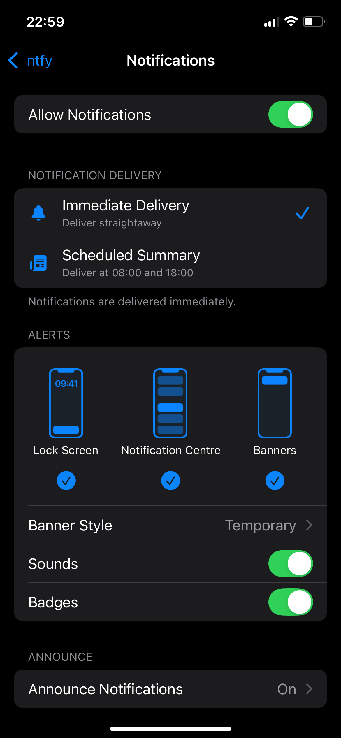 Sorry, "scheduled summary" under the notification settings was already disabled. I figured that when you turn that on, then you get the option for immediate delivery on the individual apps available to use, but unfortunately that still doesn’t change anything for me. I have attached a screenshot with how the notification settings for ntfy look like right now