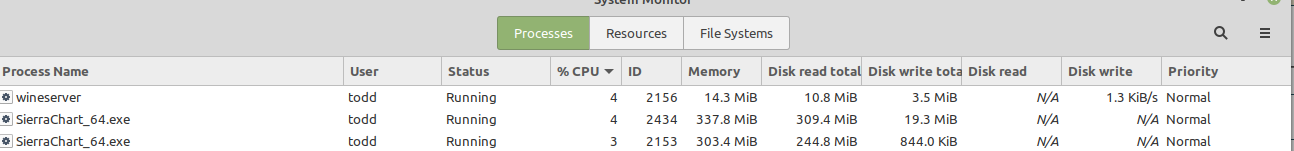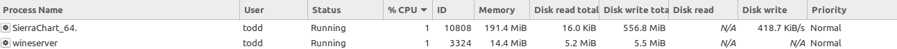 Good to hear it worked! Latest updates: Current configuration: SierraChart Version 2292 64 bit (2 instances) wine-6.14 Development Mint Linux 20.2/Cinnamon desktop Kernel 5.11.0-25 generic OpenGL X11lib: 1.7.0 AMD Ryzen 7 3800X GeForce GTX 1660 Nvidia video card w/6 GB GDDR5 and driver 460.91.03 Dual Monitors 1920X1080 60 Hz for both monitors Total System RAM: 16 Gig Memory usage: <640 Meg per instance. Higher than earlier posts due to adding 16 charts for CL CPU Utilization: <5% per SC instance 100 Charts, 7 instruments (ES, YM, NQ, RTY, GC, DAX, CL) Denali datafeed with MBO data Updated 8/8/21. |