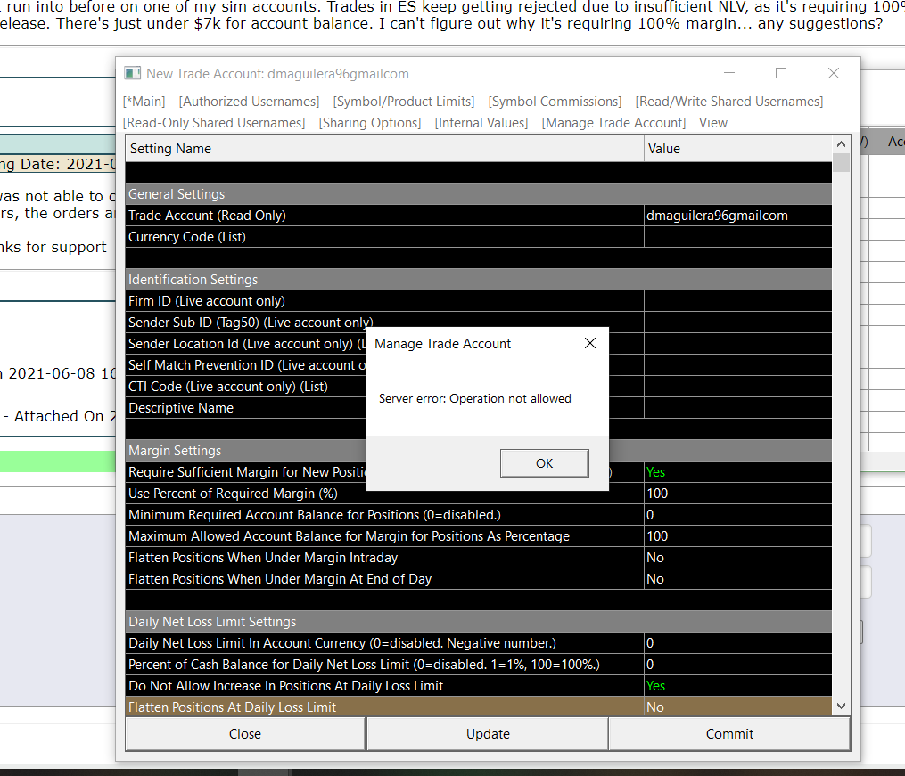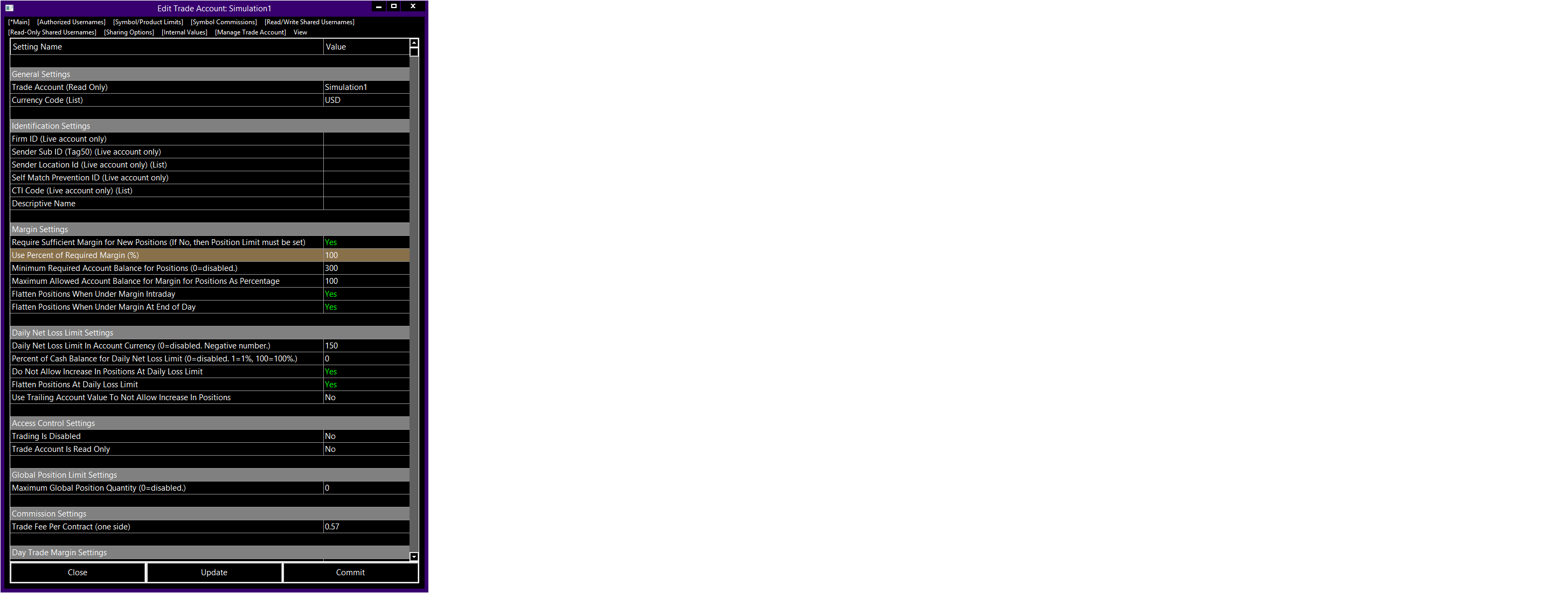 Regarding this: Trying to change margin requirements.: Setting jumps back to 100, every time I entered a different number from 100 and press Update. Ah, of course, day-trade-margin procentual settings are working, so I'm using them. No worries. Software Download: Fast Update And when you change that value, and after you are all done changing the settings, press the Commit button at the bottom. Sierra Chart Support - Engineering Level Your definitive source for support. Other responses are from users. Try to keep your questions brief and to the point. Be aware of support policy: https://www.sierrachart.com/index.php?l=PostingInformation.php#GeneralInformation For the most reliable, advanced, and zero cost futures order routing, use the Teton service: Sierra Chart Teton Futures Order Routing |