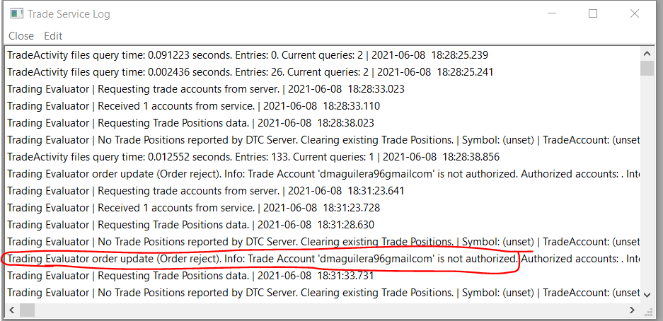 Regarding post #53, this is resolved. It appears as though there were invalid characters in the SC username, that was assigned to the trading account. Reconnect to the data feed: File Menu: Procedure to Reconnect to the Data and Trade Servers Sierra Chart Support - Engineering Level Your definitive source for support. Other responses are from users. Try to keep your questions brief and to the point. Be aware of support policy: https://www.sierrachart.com/index.php?l=PostingInformation.php#GeneralInformation For the most reliable, advanced, and zero cost futures order routing, use the Teton service: Sierra Chart Teton Futures Order Routing Date Time Of Last Edit: 2021-06-09 15:14:49