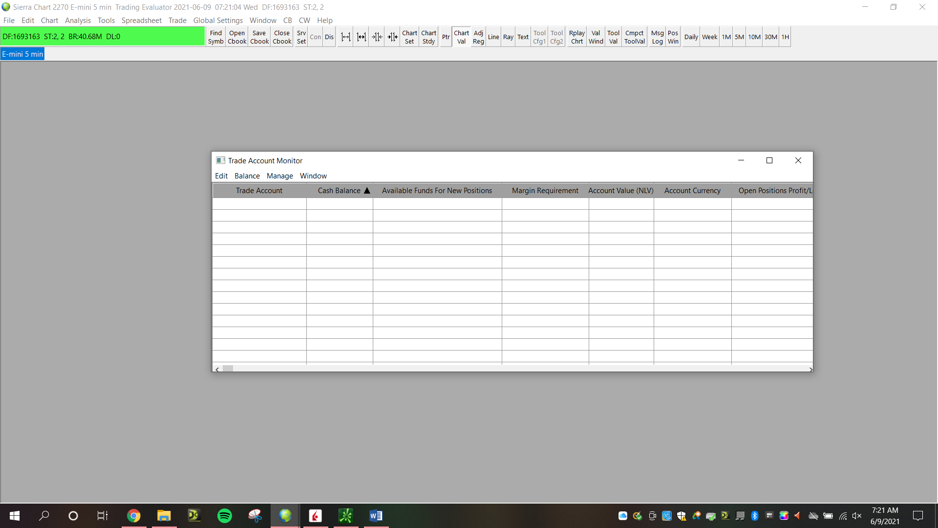 Regarding post #50 you do not need to create a new account, your trading account has already been moved to the new simulation system. You just need to follow these instructions: To continue to use this service, you need to follow the below instructions: Update Sierra Chart to the latest release: Software Download: Fast Update After the update, in your installation of Sierra Chart which you use with this simulated trading service, select "Global Settings >> Data/Trade Service Settings". The "Current Selected Service" needs to be set to "Trading Evaluator". Set the "Service Settings >> Use Enhanced Trade Simulation Service" to Yes. Press OK. Reconnect to the data feed: File Menu: Procedure to Reconnect to the Data and Trade Servers You should see your new account on the Trade Window: Basic Trading and the Trade Window: Main/C >> Trade Account (Selecting Trade Account for Chart / Trade DOM) I'm having an issue I haven't run into before on one of my sim accounts. Trades in ES keep getting rejected due to insufficient NLV, as it's requiring 100% margin. In the settings, it's set to use 5%. I've reconnected, and also updated to the current release. There's just under $7k for account balance. I can't figure out why it's requiring 100% margin... any suggestions? Percent of margin can now be set per product. Edit your trade account, and then go to the Symbol Limits tab and then set Use Percent of Required Margin to 0 to disable this for the product. Do that for all listed products. Also do that for ALL_SYMBOLS. That may be the only listed product.