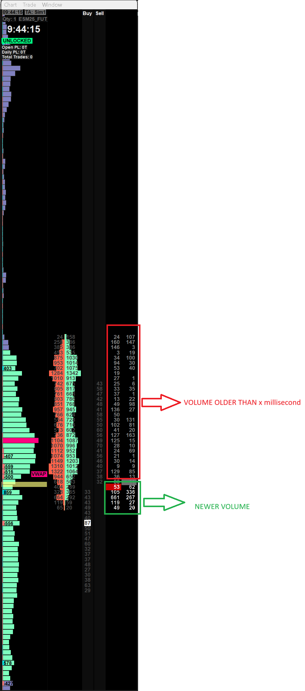 User344261, this custom study might do the trick for you. It allows periodical reset of the recent and current traded volume columns. It can also reset the pull/stack columns and recenter the DOM periodically. The reset frequency is set by the chart period. Clear/Reset Pulling/Stacking Data via ACSIL | Post: 405333 |