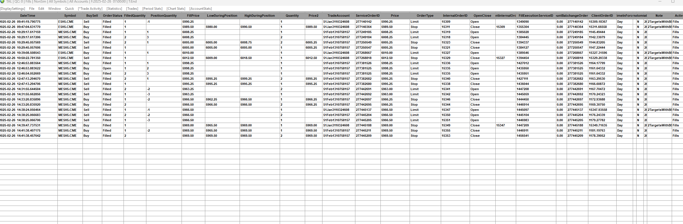 ok so here is what is happening...i place an order on pc#2 - I can on dom on pc #2....but I cannot see the order on a chart (yes i have chart trade on and show orders and posisiton) ... nor can i see the order or the fills in the trade log on pc#2 if i pull up the trade log on pc#1, where i did not place the order, i can see it... attached please fiond a picture of pc#1 trade log...the S1feb account was not traded on this pc..pc#1 Date Time Of Last Edit: 2025-02-26 20:15:48